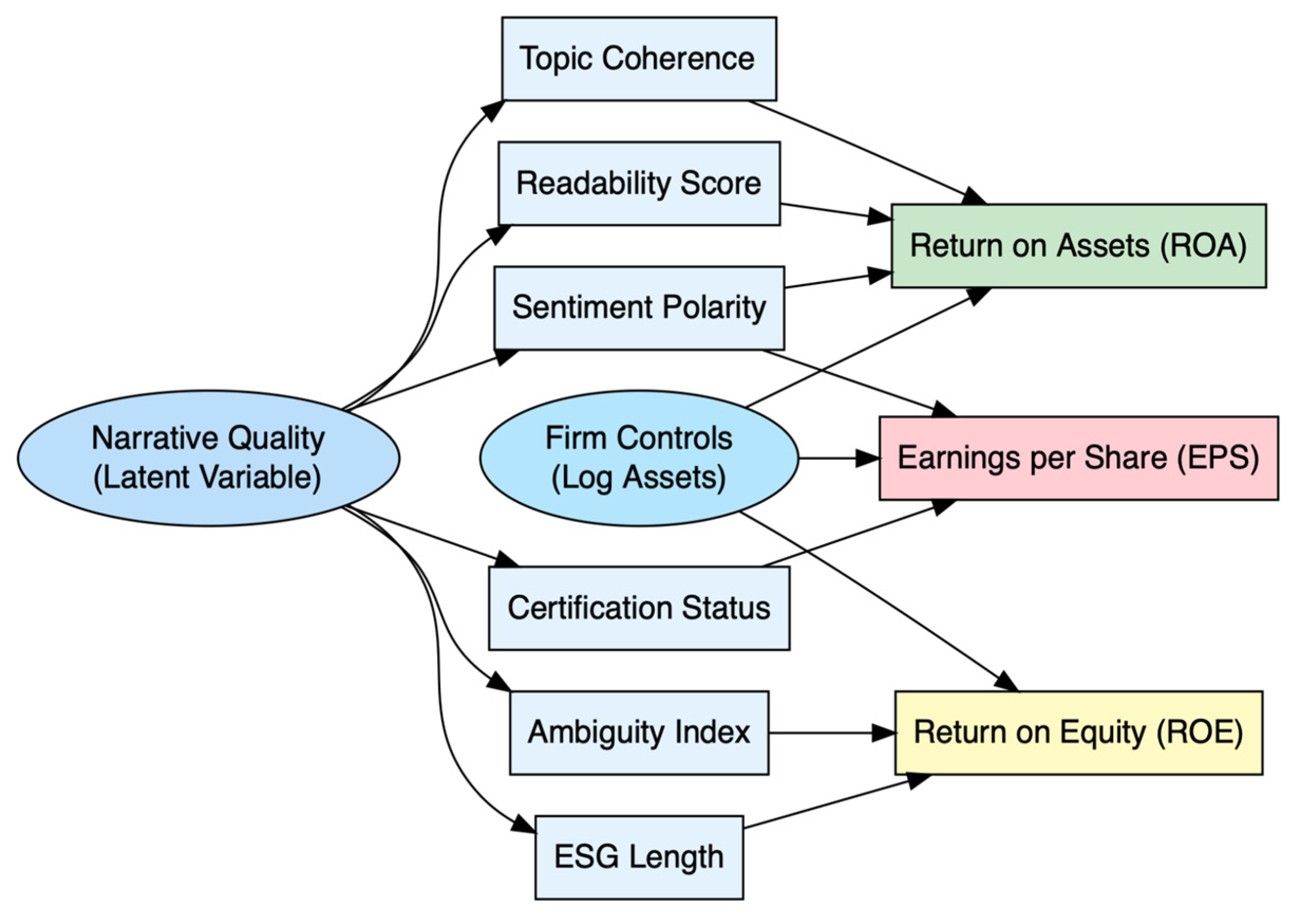 The relationships among the narrative quality variables and financial metrics are visualized in