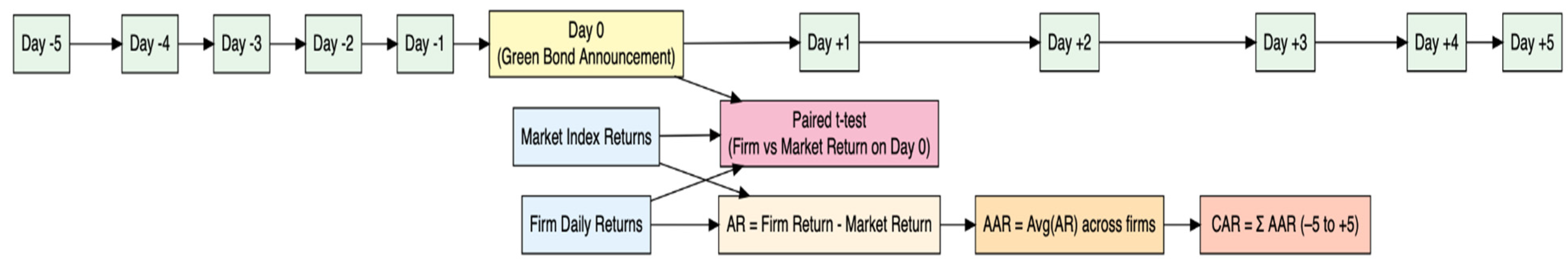 However, the paired-sample t-test comparing firm returns and market returns on the announcement day yielded no statistically significant difference (p > 0.05). This indicates that while investors generally respond positively to green bond signals, the immediate price impact is too small to be separated from overall market movement on that single day.