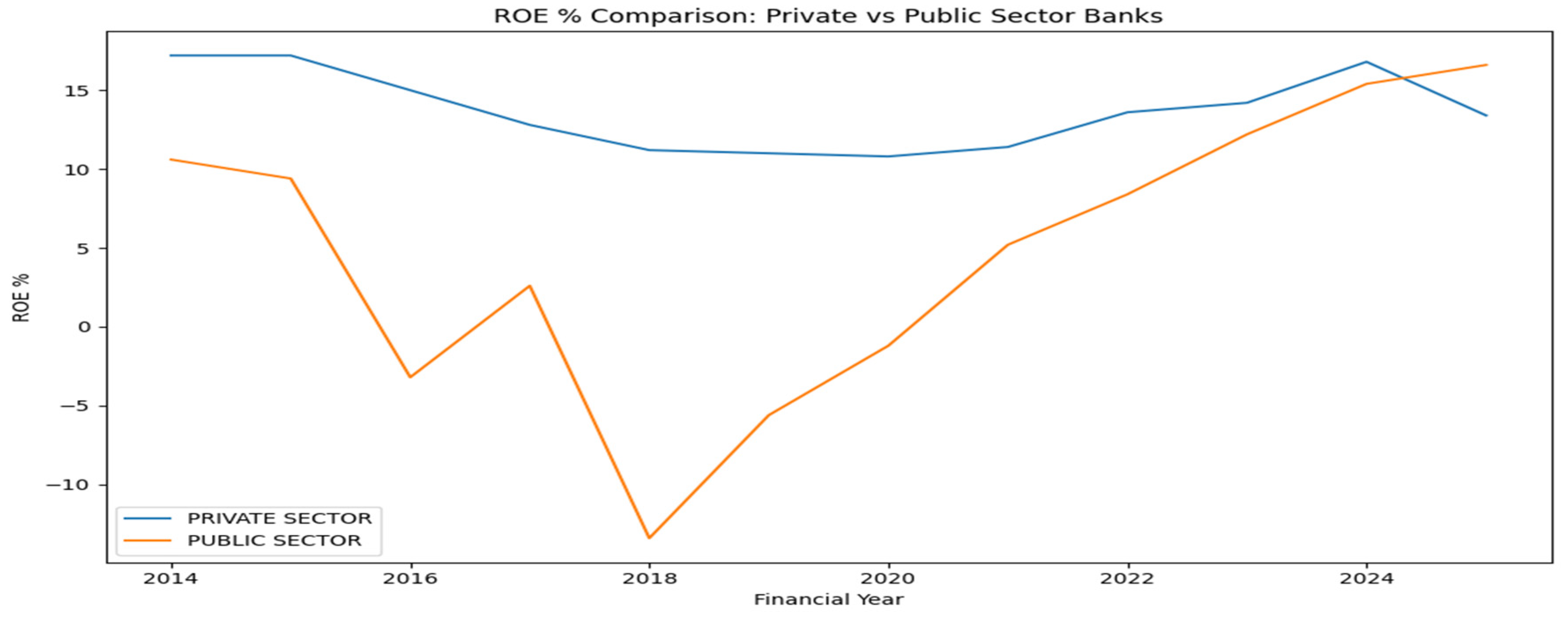 p ≈ 0.97), indicating that the pandemic did not materially affect ROE in the aggregate model. Private banks sustained stable ROE during 2020–2022 through strong fundamentals and risk management, while public banks improved gradually with regulatory support and capital infusion. Despite sectoral differences, the pandemic’s direct impact on ROE was negligible, emphasizing structural factors and long-term strategies (