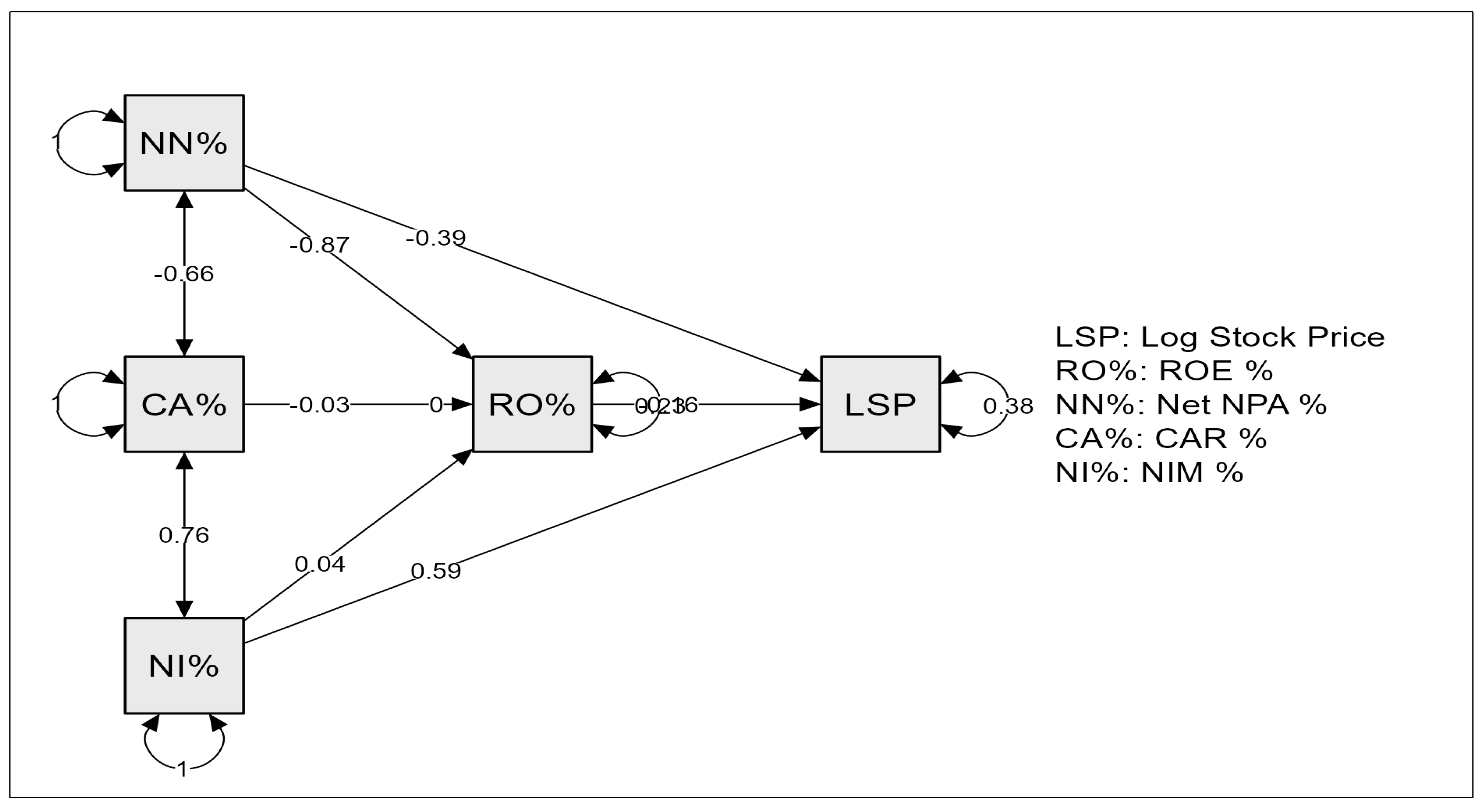 Net NPA% exhibited a significant negative effect on log stock prices (β = −0.390, p = 0.003), indicating that higher non-performing assets are associated with lower stock prices. Conversely, NIM% showed a strong positive effect (β = 0.589, p < 0.001), suggesting that improved net interest margins enhance stock valuation. CAR% does not have a significant direct effect (β = −0.002, p = 0.979).