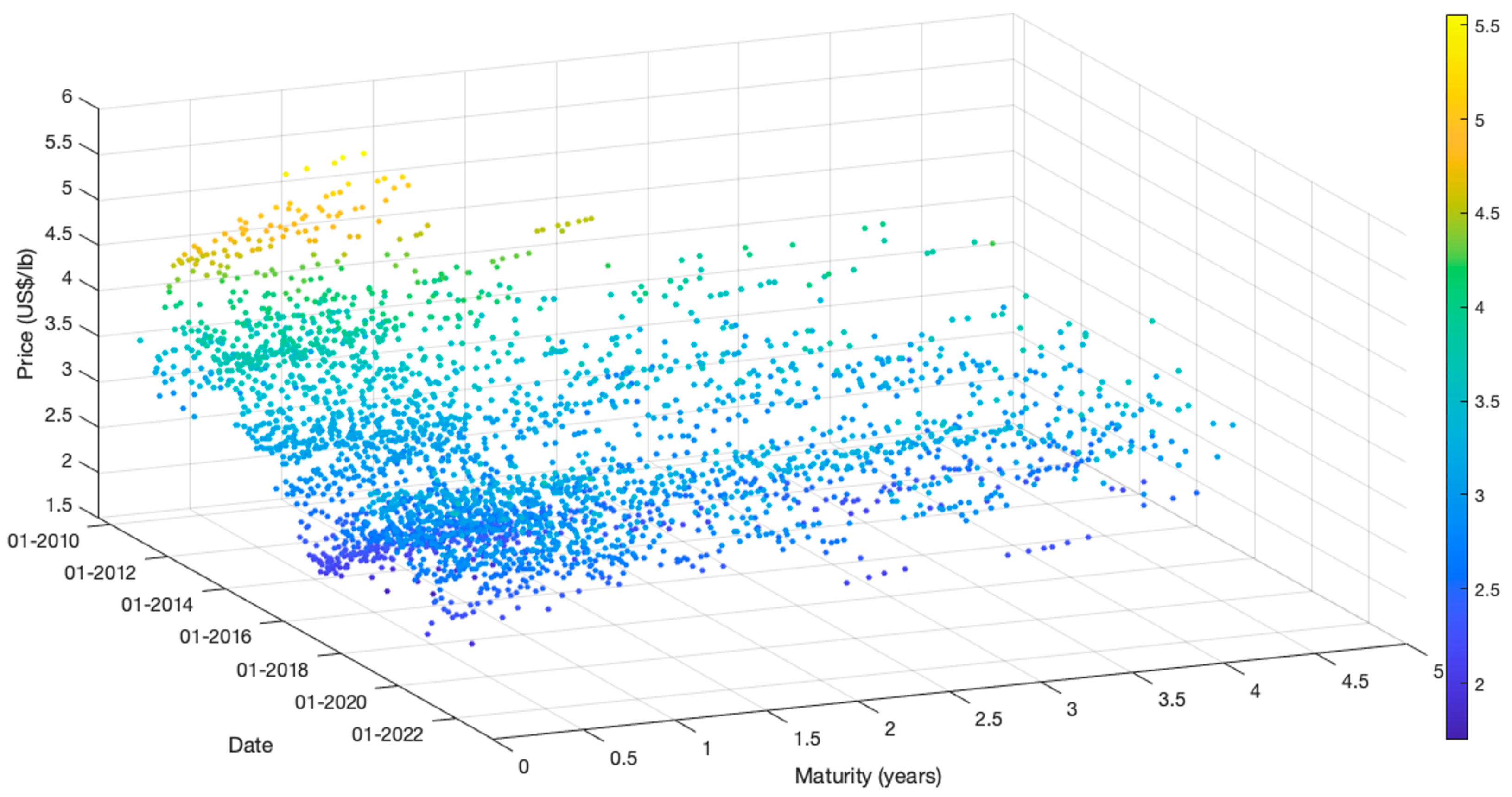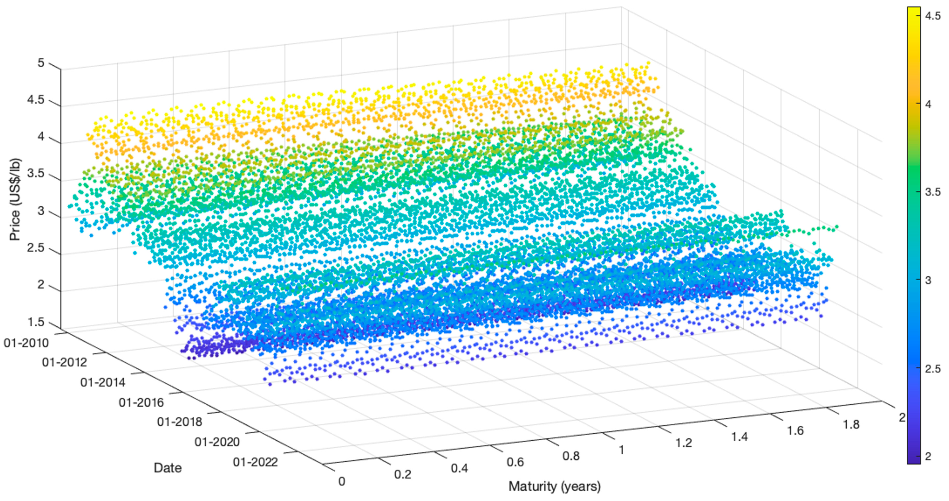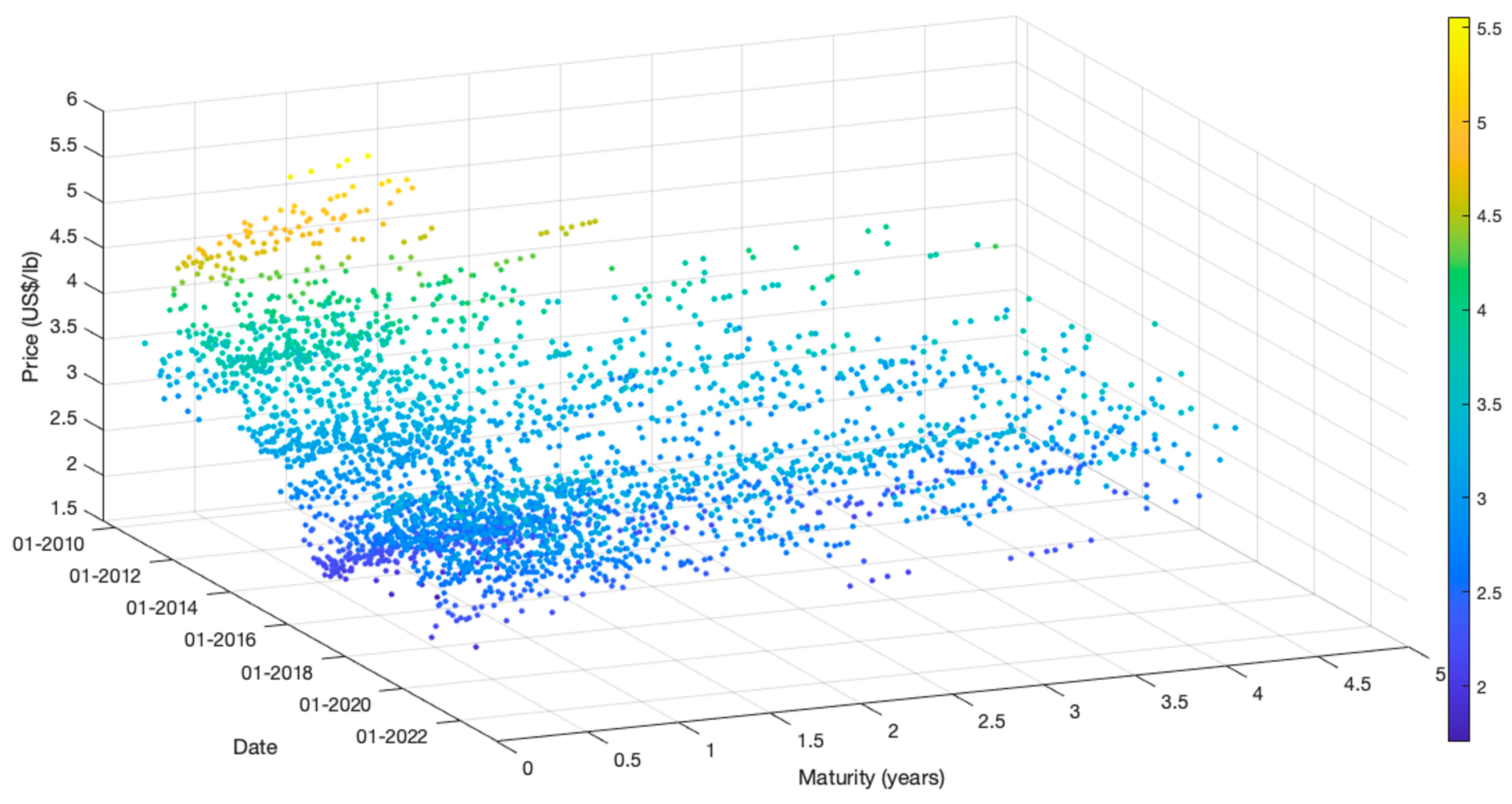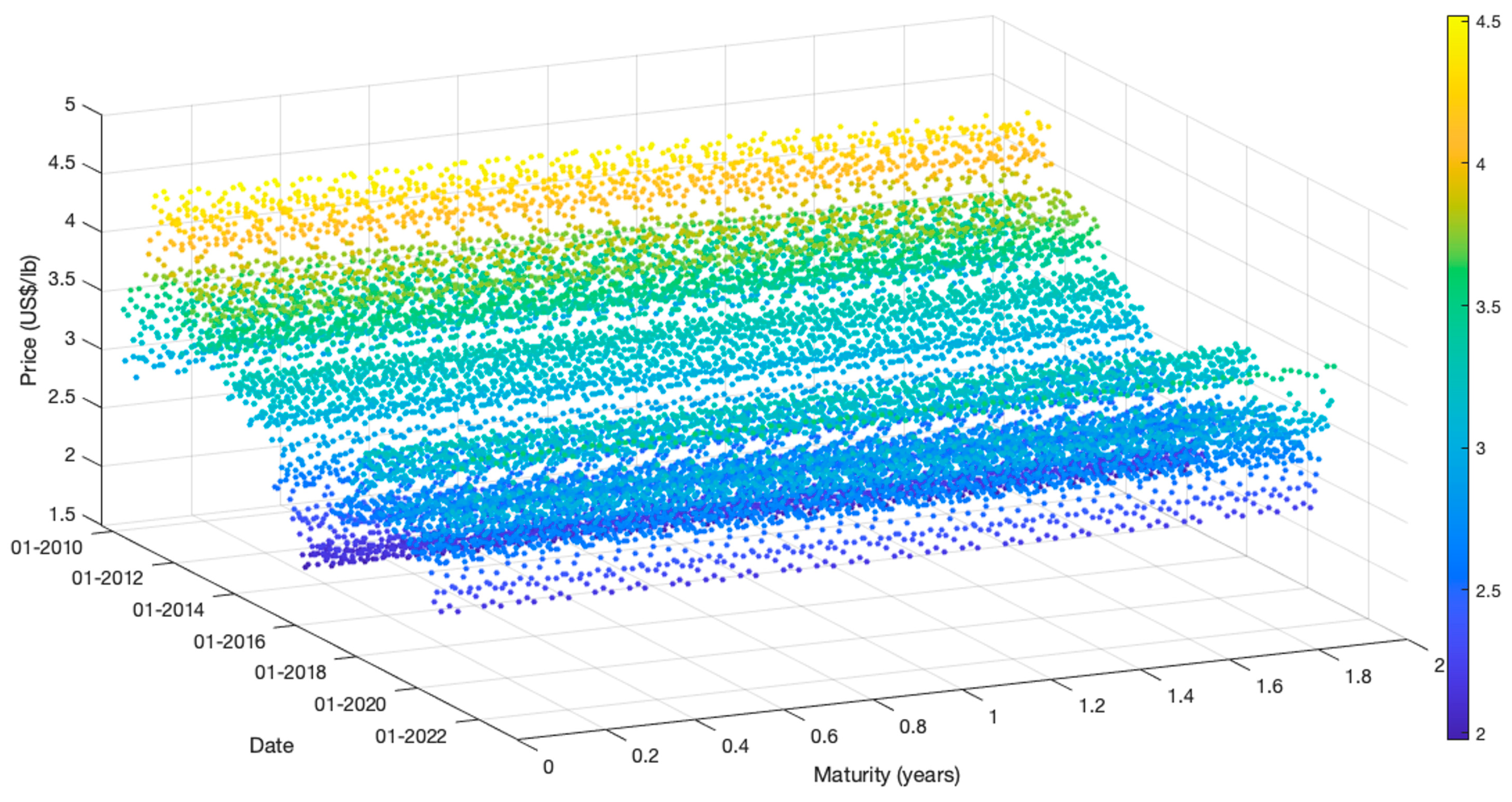 2020) model for copper prices. This model integrates analysts’ forecasts and futures prices by proposing a three-factor stochastic model to estimate futures prices, expected prices, and the term structure of risk premiums for copper. The model uses both futures prices and analysts’ expectations obtained from Bloomberg. Initially developed to estimate risk premiums, this model will now be studied for its forecasting ability regarding copper prices. The research hypothesis is that including futures price data outperforms using only analysts’ forecasts of short- and medium-term