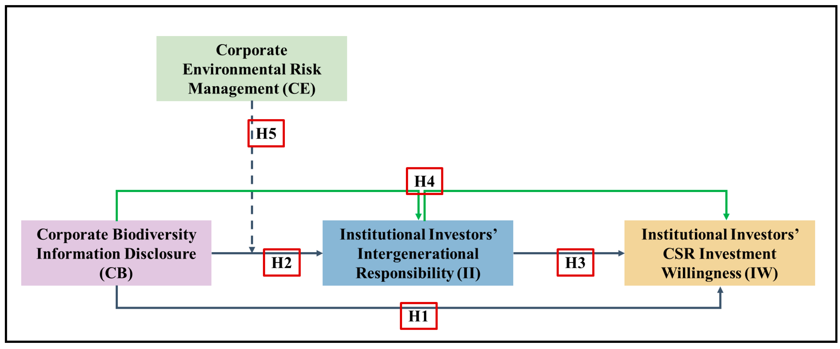 The intersection of corporate biodiversity information disclosure, intergenerational responsibility, and environmental risk management introduces a novel perspective in the literature on sustainable finance. While previous studies have explored the relationship between environmental disclosures and investment decisions, few have considered the combined effects of biodiversity disclosures, intergenerational responsibility, and risk management on institutional investors’ CSR investment willingness. Hence, by integrating these factors, this research offers a comprehensive framework for understanding how corporate sustainability practices—specifically biodiversity disclosures can influence the investment willingness of institutional investors.