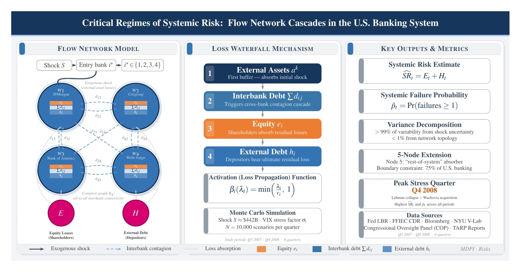 Montañez Jacquez S, Quezada Téllez LA, Morales Mendoza R, Moya-Albor E, Fernández Anaya G, Santos Moreno M. Critical Regimes of Systemic Risk: Flow Network Cascades in the U.S. Banking System. Risks. 2026; 14(4):73. https://doi.org/10.3390/risks14040073