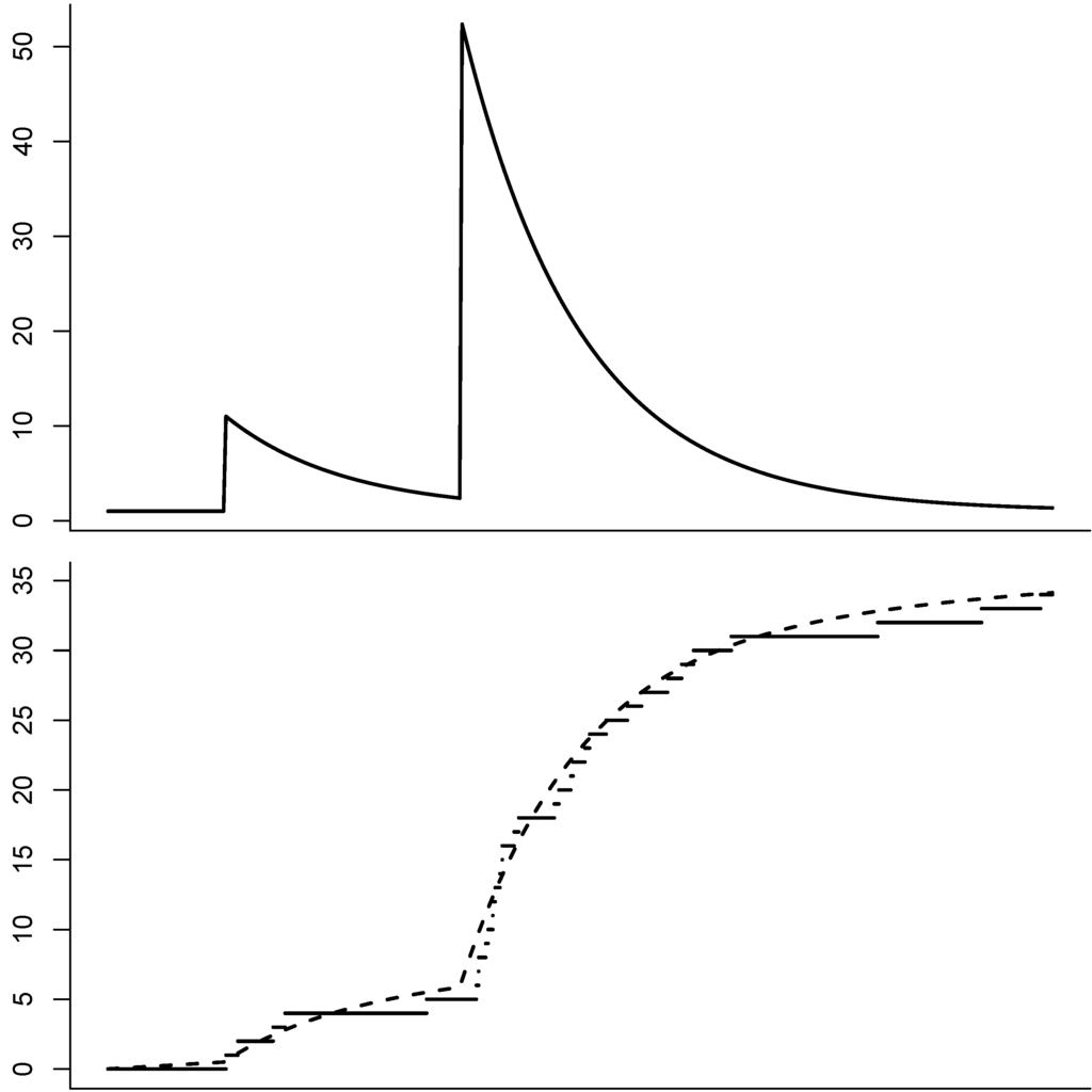 Illustration of a shot-noise process (Top) with exponential structure. The graph on the bottom shows a counting process whose jump times have the shot-noise process as intensity ℓ. The dashed line is the cumulated intensity process .