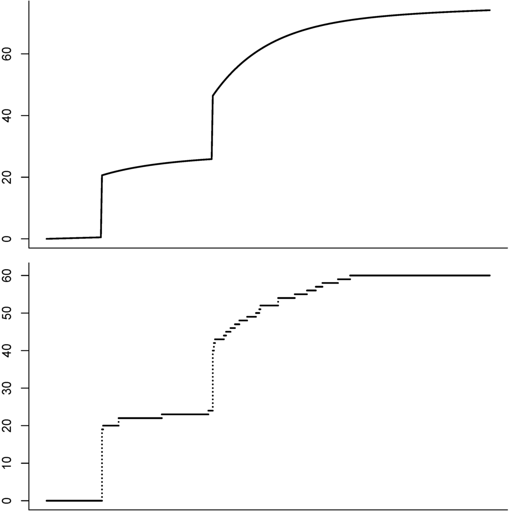 Algorithm 1. Simulate one path of the shot-noise process S and, afterwards, a vector of claim arrivals together with associated claim sizes. A realized path may be found in Figure 3.