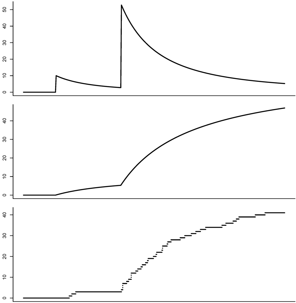 Simulation of a claims process driven by a shot-noise process with rational structure. The graph shows the intensity process ℓ (Top), the cumulated intensity process (Middle) and the simulated claims process (Bottom).