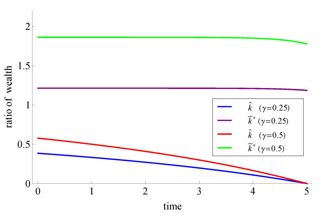Figure 1 shows the optimal strategies for and for different values of γ. For these parameters, we have that , and therefore, by Lemma 6, we have that for all , and it is optimal to follow the indifference strategy before the market crash.