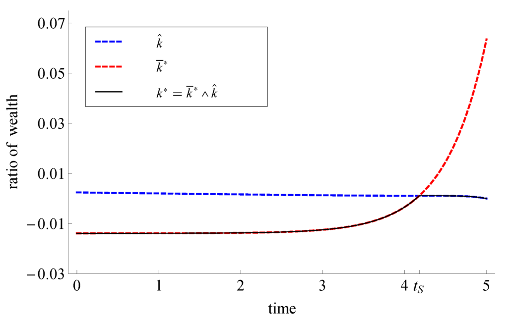 Now, if , it can happen (depending on the choice of parameters) that for some . In Figure 3, for example for and , it is not optimal to follow the indifference strategy before the market crash. Indeed, the investor has to follow the post-crash strategy for , where denotes the intersection point of and . Only after , he will follow the indifference strategy . Note that, due to the high rate of relative risk aversion (), the investor invests at most 0.02% of his wealth in the risky asset before the market crash occurs. If the market crash occurs before time , he will stay at the post-crash strategy for all .