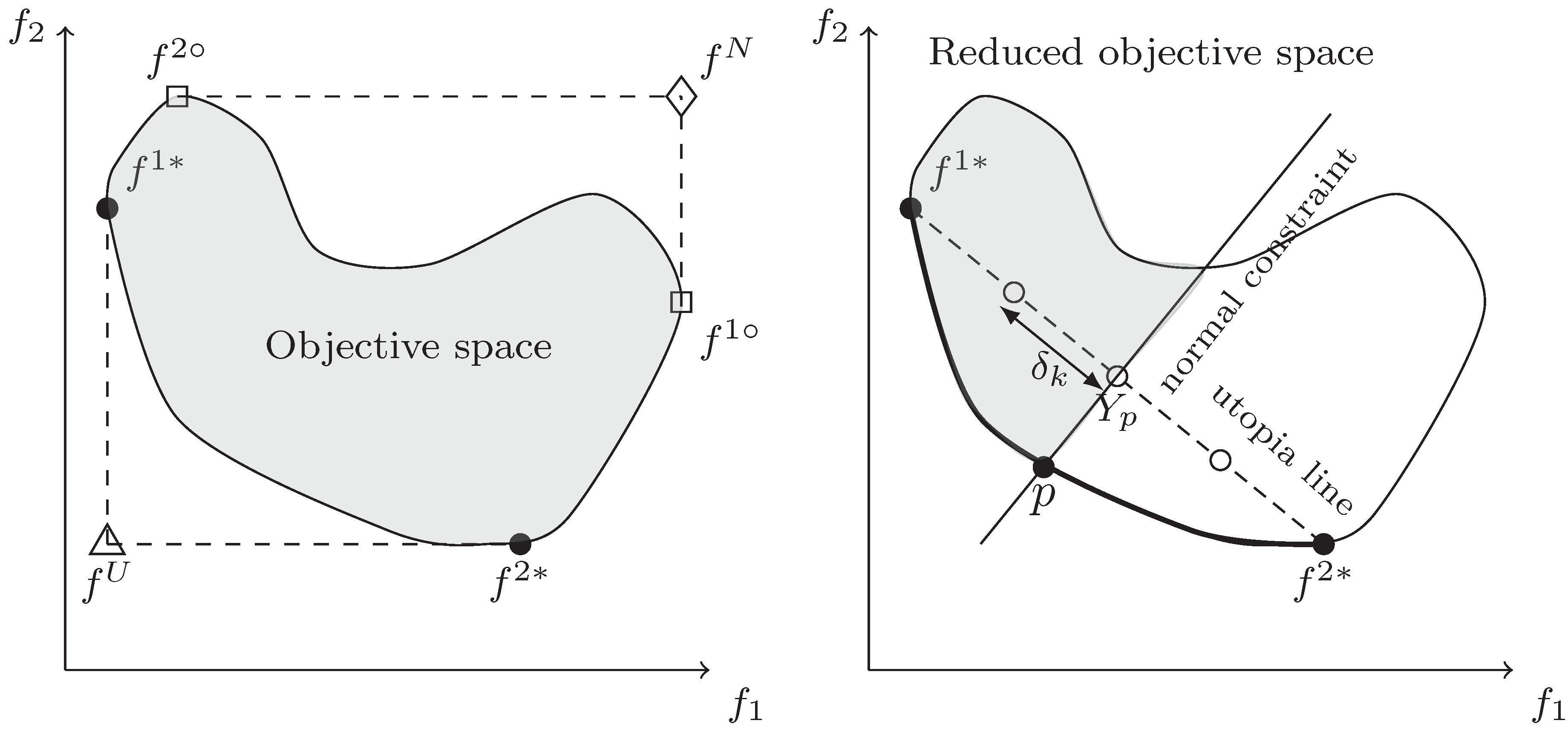 Graphical representation of the reference points (on the left) and of the normal constraint (NC) method (on the right) for a bi-objective sample optimization problem.