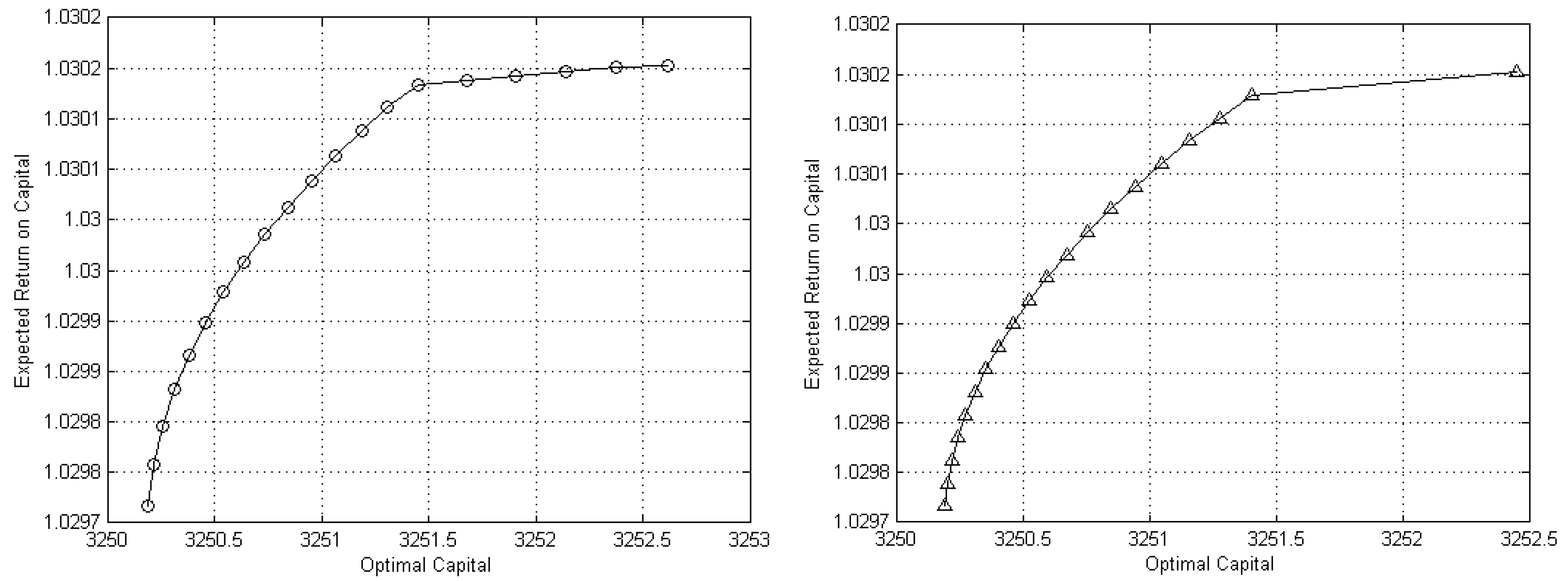 It is also useful, for practical purposes, to conduct a qualitative analysis based on the direct comparison of the two dotted approximations of the true Pareto front. Figure 2 displays on the chart at the left the dotted representation of the efficient frontier obtained by using the proposed version of the NNC method with 20 solutions, whereas the chart on the right provides the solution set detected by the ϵ-constraint method. The comparison of the plots highlights the ability of the proposed version of the NNC method to identify Pareto optimal solutions along the entire Pareto front with respect to the ϵ-constraint method. In fact, while the former detects four solutions for optimal capital values between 3251.5 and 3252.5, the latter is unable to find any optimal portfolios in that rage, crucially limiting the set of optimal risk-return alternatives to the decision-maker. Thus, we will adopt the proposed version of the NNC method as the procedure for generating the Pareto front in the remaining experiments.