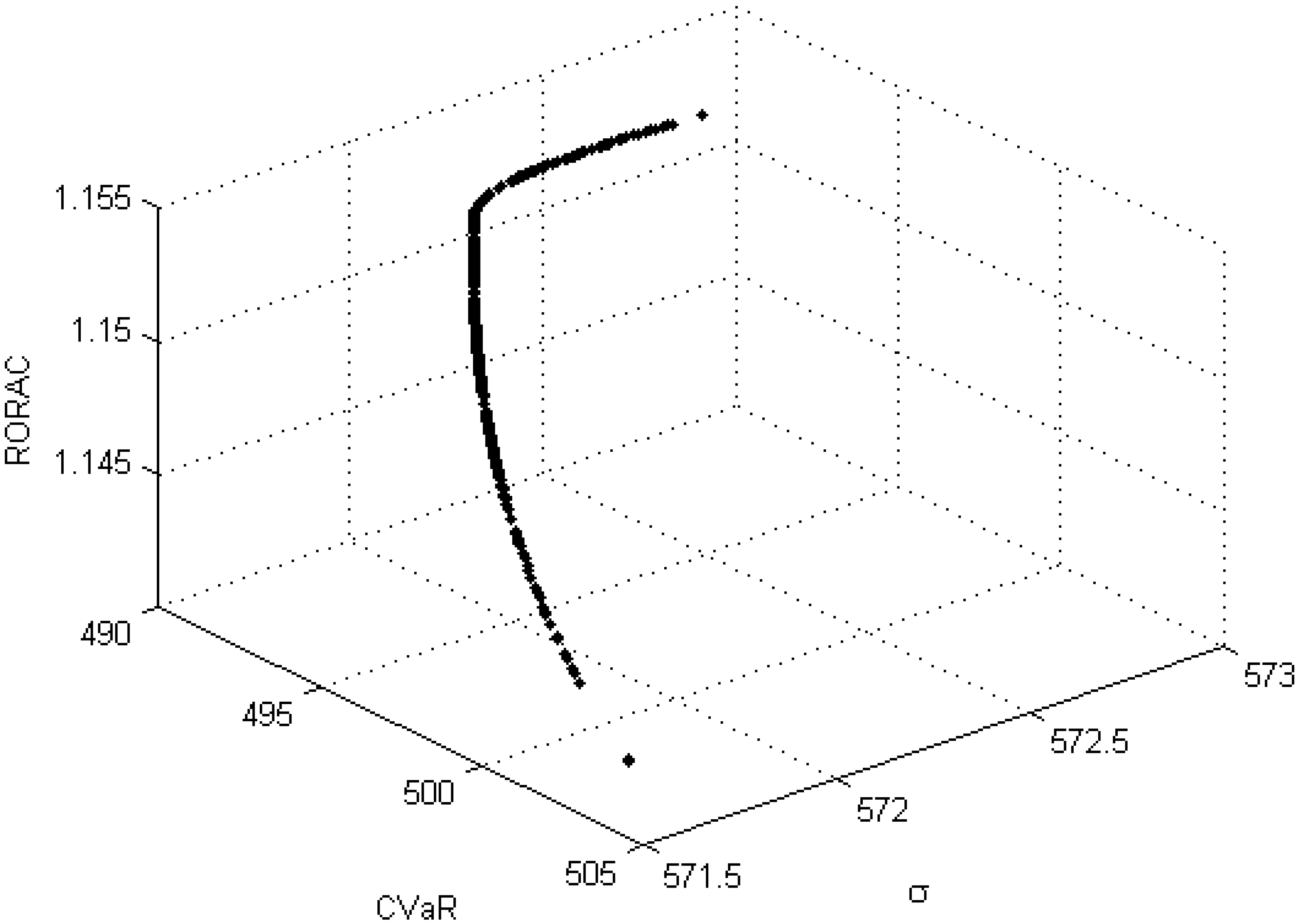 The third portfolio selection strategy, given in Problem (17), optimizes at the same time three performance measures. A dotted approximation of the Pareto front with 275 optimal portfolios is provided in Figure 5 from which we can argue that this set is a surface in the -- space. The qualitative tradeoff analysis is conducted by considering the bi-dimensional projections of the Pareto front displayed in Figure 6, as well as by evaluating the correlation matrix of objectives reported in Table 7. More precisely, the first chart on the left displays the region in the - plane where the efficient portfolios lay; however, it does not assist in the tradeoff analysis; at the same time, from Table 7, it emerges that the correlation between and is , indicating that shows the same upward movements of . Conversely, the decreases as increases, as suggested by the inspection of the chart on the right and confirmed by the sign of the correlation (). Analogous considerations affect the relation between and , which presents the behavior displayed in the chart below of Figure 6 with a negative correlation (). Furthermore, it may be interesting for risk management purposes to conduct a tradeoff analysis of the implicit risks and capital involved. In Figure 7 are displayed the charts of vs. invested capital and of vs. portfolio volatility, while in Table 8 are reported the corresponding correlations. By comparing the results, on the one hand, the pronounced negative relation between and shareholders’ invested capital stands out, with a correlation equal to , which is a direct consequence of the definitions of and given in Equations (1) and (4), respectively, and, on the other hand, the positive dependence between and σ, with a correlation equal to , which supports the findings relative to the - tradeoff analysis.