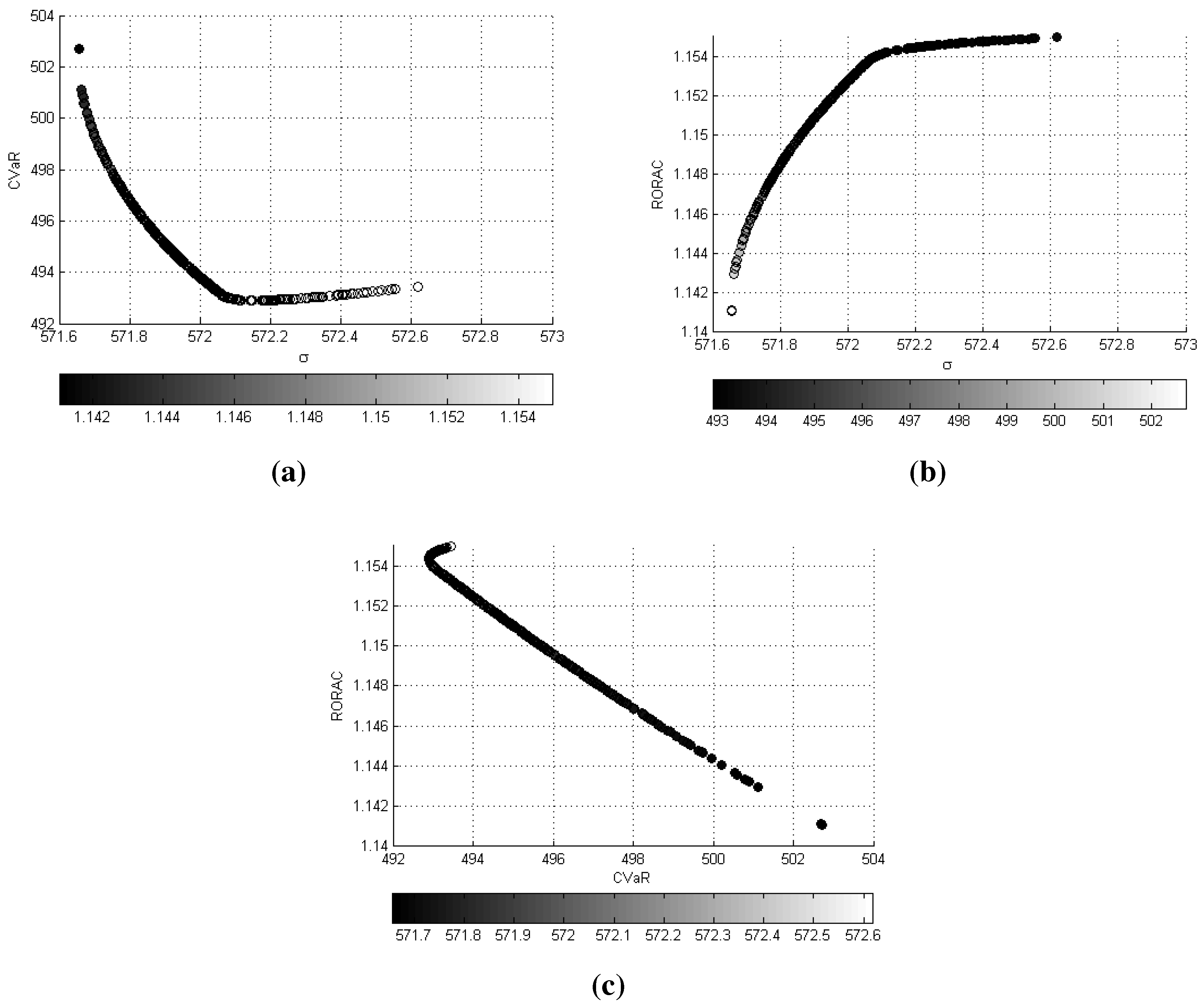 The optimal asset allocation in the presence of two risk measures is represented by Problem (15). On the basis of the dotted approximation in Figure 3 made by 453 optimal points, it can be noted that the set of solutions is a curve in the tri-criteria space σ--. In order to analyze the interactions among the objectives, it is useful to consider the projections of this curve onto the σ-, σ- and - planes. The results are displayed in Figure 4, where the colored scatter plots represent the solutions in the corresponding plane with the color providing the intensity of the third objective. A color bar below each chart is added to describe the range of the third objective. The following qualitative considerations may be derived. The first chart sheds light on the link between risk-adjusted capital and portfolio volatility: until , decreases as volatility increases, conversely, when , increases as volatility increases. The second chart reveals that is a non-decreasing and concave function of σ. Furthermore, by integrating the information of the first chart, we can conclude that for , a decision-maker may increase the performance measure by simultaneously increasing σ and reducing . However, if he aims to obtain values greater than 1.154, he has to handle more risk in terms of both σ, as well as . If an investor mainly focuses on the tradeoff between and , he may operate his decisions in accordance to the third chart in Figure 3, where the efficient frontier in the plane - is displayed. If the analysis is extended to include the considerations relative to the volatility, he may conclude that the - solutions correspond to those portfolios for which the increases when σ increases.