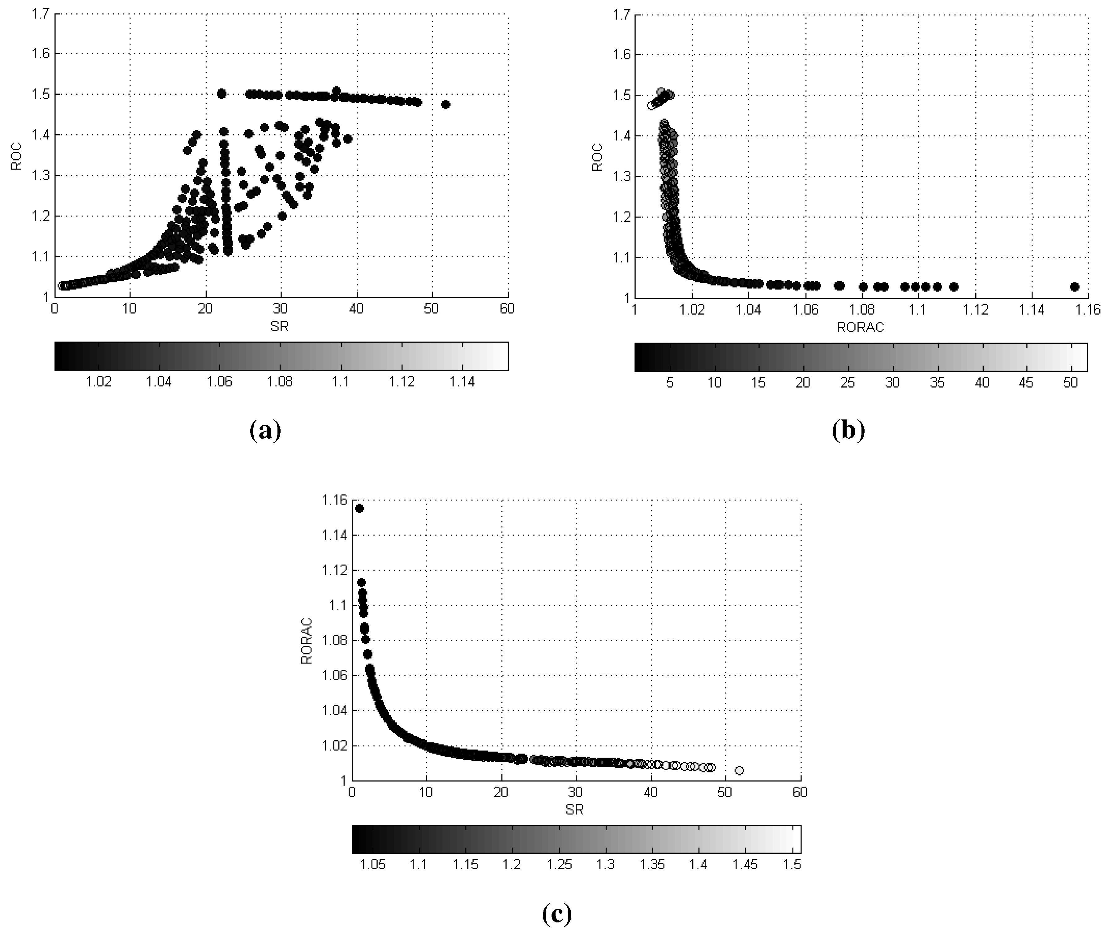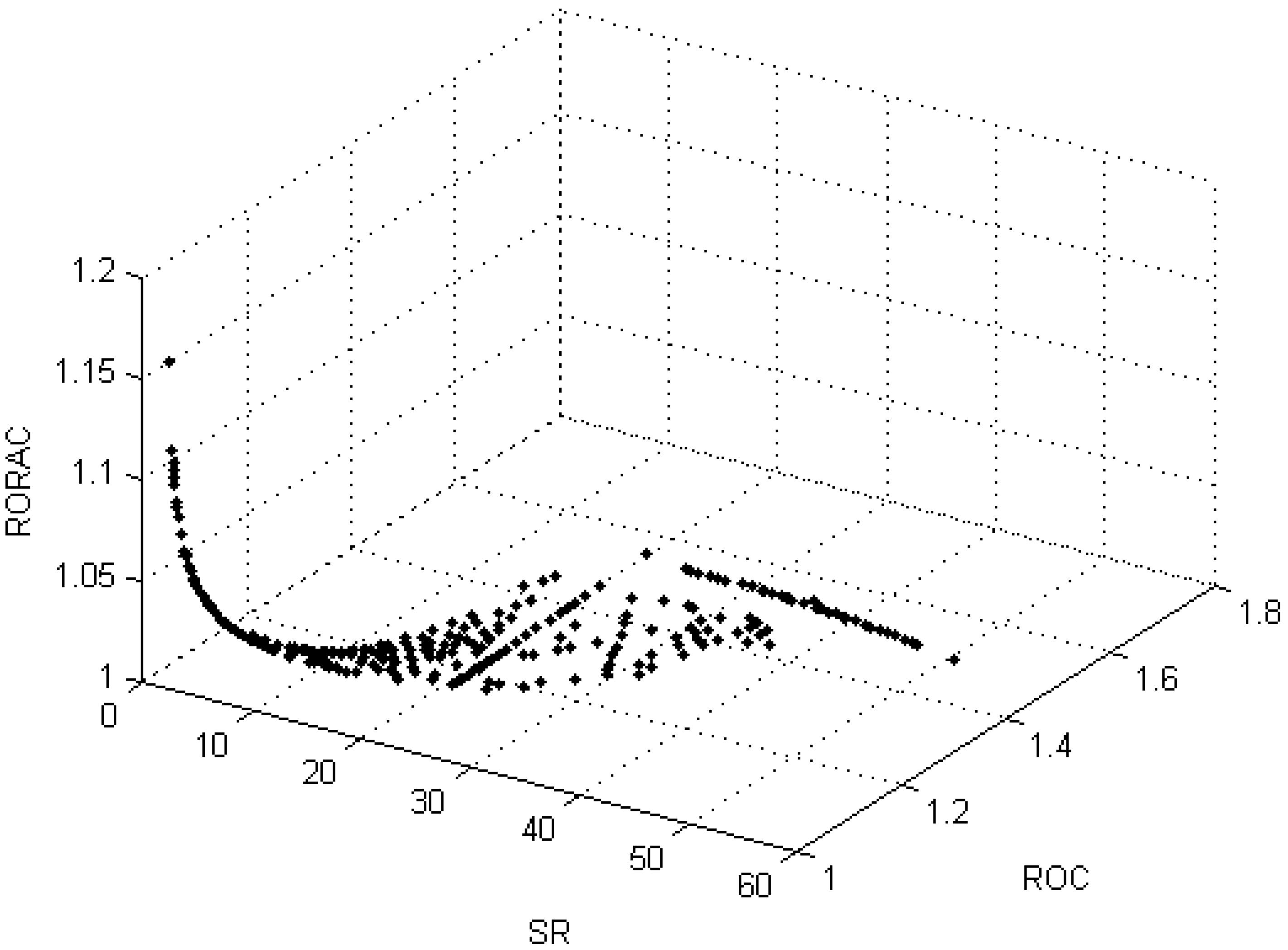 The third experiment takes into account the performance measures , and Sharpe ratio . The solutions set results in being a surface in the -- space. The tradeoff analysis in this case is based on the bi-dimensional projections and on the correlation matrix of the objectives. Considerations of the behavior of in relation to the optimal invested capital and to the portfolio volatility are also derived.