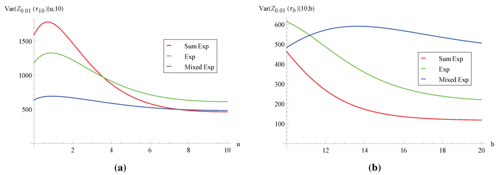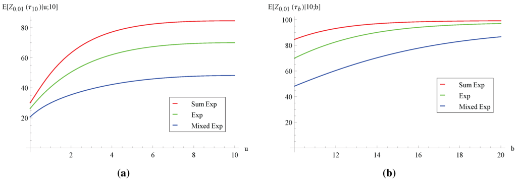 In all upcoming numerical examples, it is assumed that the Poisson arrival rate is , the premium rate is and policyholders and shareholders have the same force of interest . Three different claim distributions will be considered, namely: (i) a sum of two exponential random variables with means 1/3 and 2/3; (ii) an exponential distribution with mean one; and (iii) a mixture of two exponential distributions with means two and 1/2 and mixing probabilities 1/3 and 2/3, respectively. Their densities are (i) , (ii) and (iii) , which are all in the form of Equation (24). While they all have the same mean of one, they possess different variances of 0.56, 1 and 2, respectively. Each of Figure 1 to Figure 9 contains two subfigures, (a) and (b), where (a) plots the quantity of interest against u () for fixed , while (b) plots the same quantity against for fixed . The curves corresponding to the three claim distributions above are represented in red, green and blue colors, respectively.