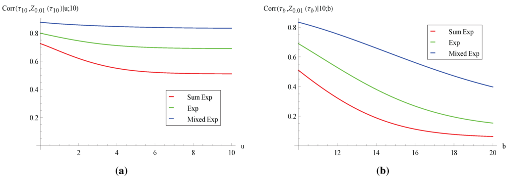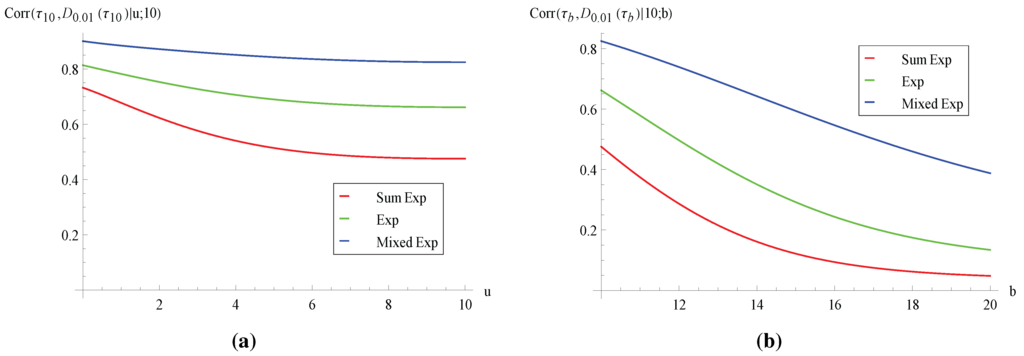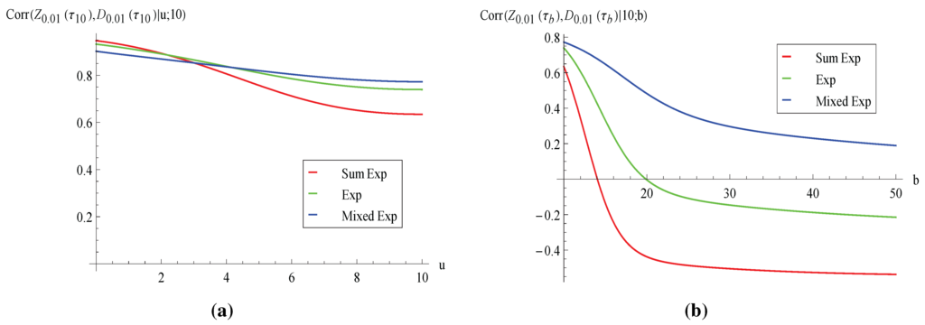 Finally, we consider the covariance and the correlation of the aggregate discounted claims and the total discounted dividends in Figure 8 and Figure 9. Although the covariance in Figure 8a is always positive, in Figure 8b takes negative values as b gets larger when the claim distribution is exponential or a sum of two exponentials. The fact that the covariance is possibly negative may be explained as follows. For fixed , we already know from previous discussions that both and tend to be larger when is large. Meanwhile, it should be noted that both claims and dividends are paid from the insurer’s surplus (which consists of the initial surplus plus the premium collected to date). In this regard, one can argue that and may also move in opposite directions. If the covariance is negative, then it means that the latter effect dominates. While the curves in Figure 8a and Figure 9a as a function of u are not ranked according to the variance of the claim distribution, those in Figure 8b and Figure 9b as a function of b suggest that both covariance and correlation increase with the claim’s variance (except for a very, very small portion in Figure 8b, where the green line is slightly above the blue line when b is close to 10).