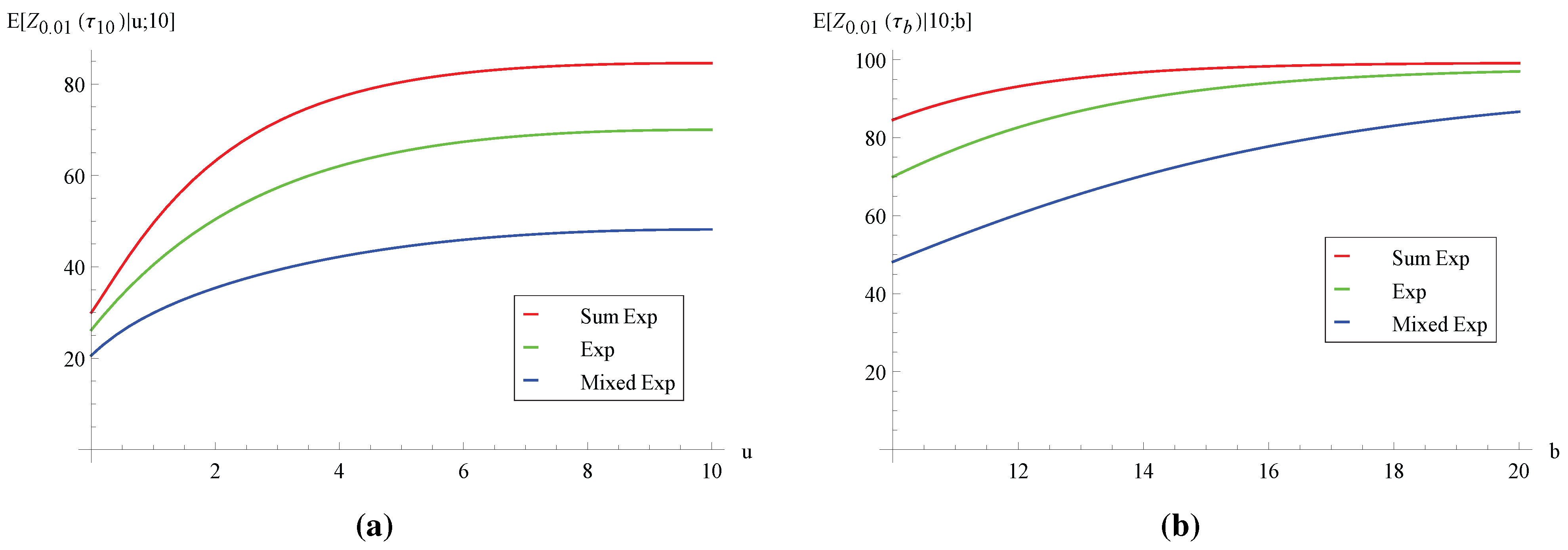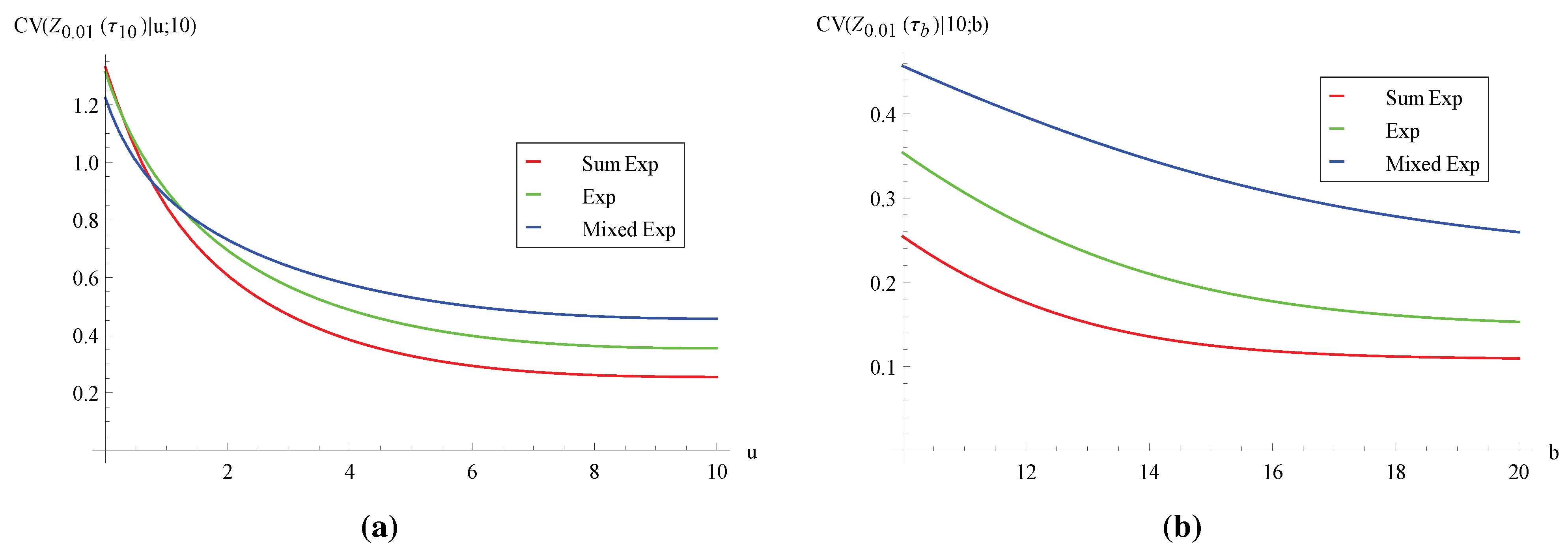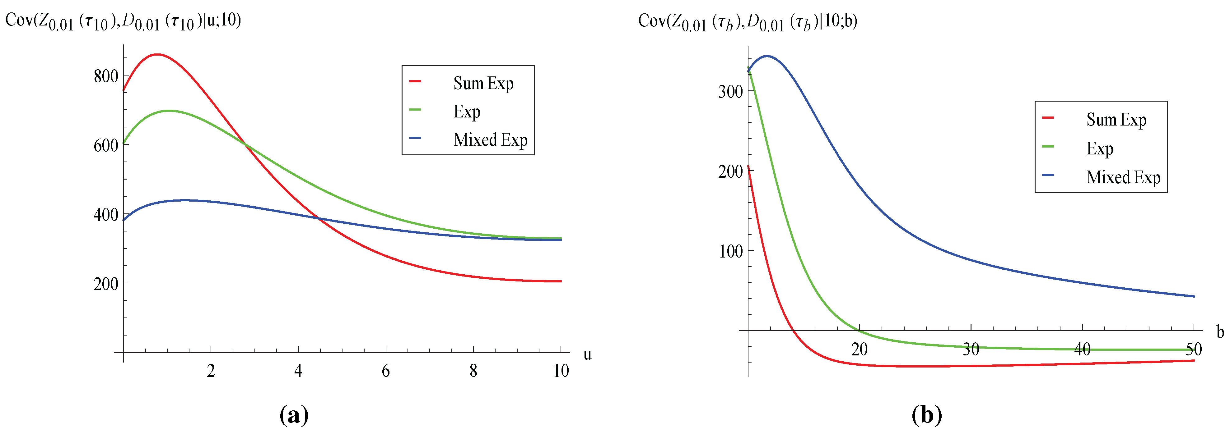 Now, we shall apply the results in the previous sections to study some new ruin-related quantities with numerical examples. Throughout this section, we assume the cost function , so that is the aggregate discounted claim amounts until ruin. The quantities of interest include the expectation and the variance of , as well as the covariances between any two of , the total discounted dividends until ruin and the time of ruin . For our purposes, it will be sufficient to use the penalty function . For simplicity, we shall use to denote the expectation of the random variable X given an initial surplus and dividend barrier b. Then, the variance and the coefficient of variation of X are and , respectively. Similarly, and , respectively, represent the covariance and correlation of and given and barrier b. All of the components required for our analysis are obtainable from the Gerber–Shiu function in Equation (3). While the k-th moments of and are simply and , respectively, the k-th moment of is given by (and we only need ). Moreover, one has , and the first order joint moments involving are and .