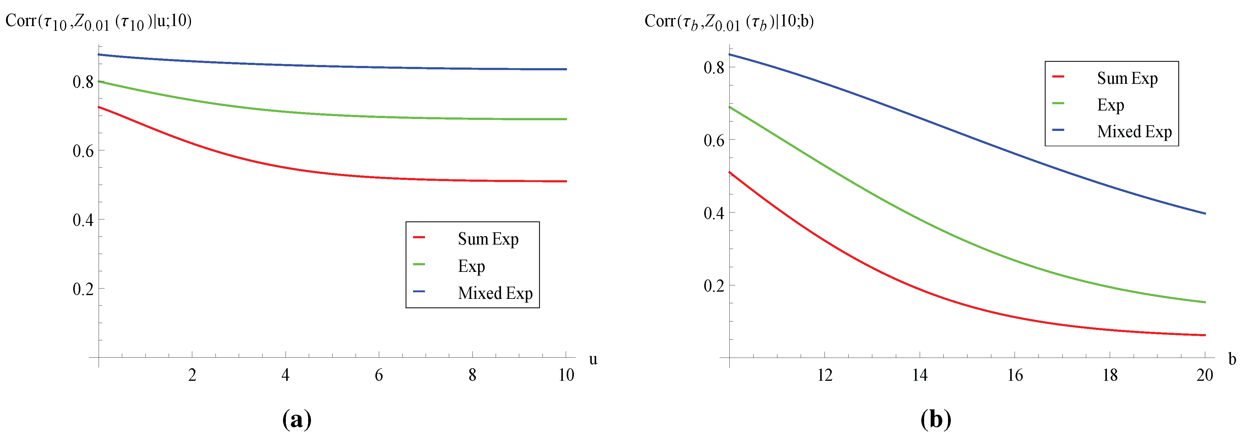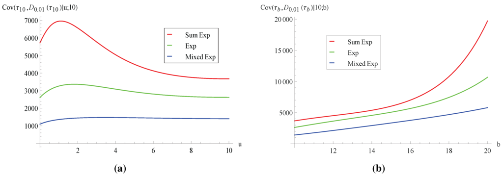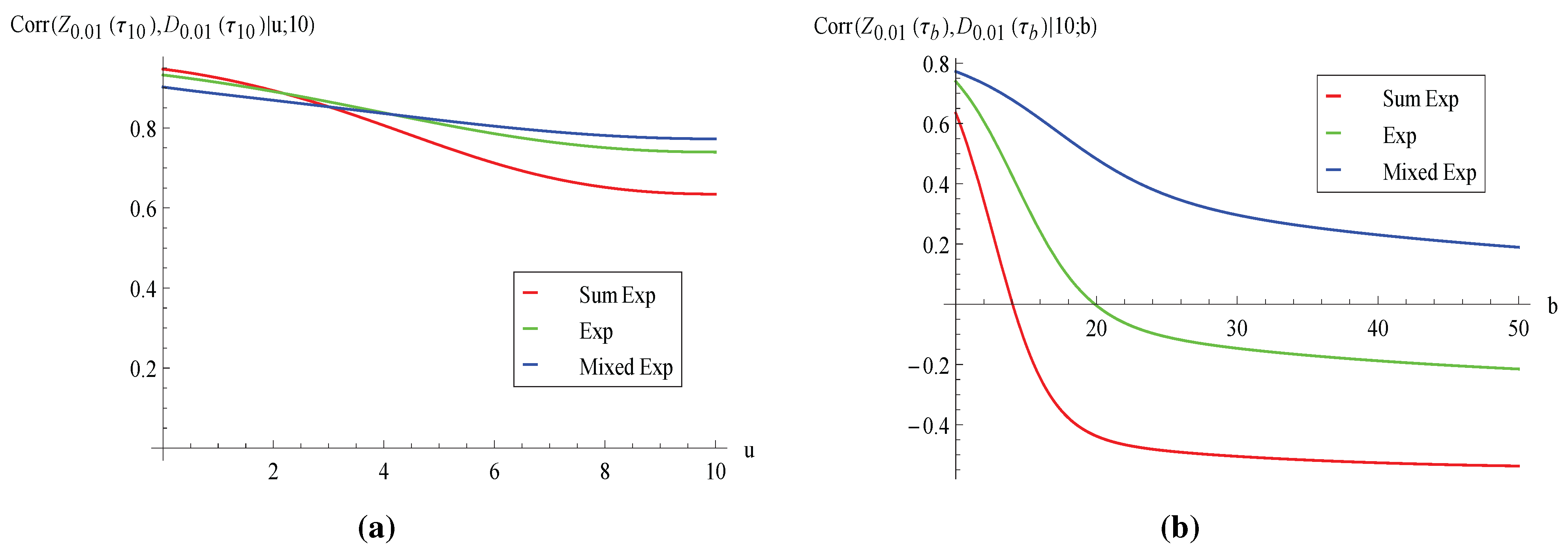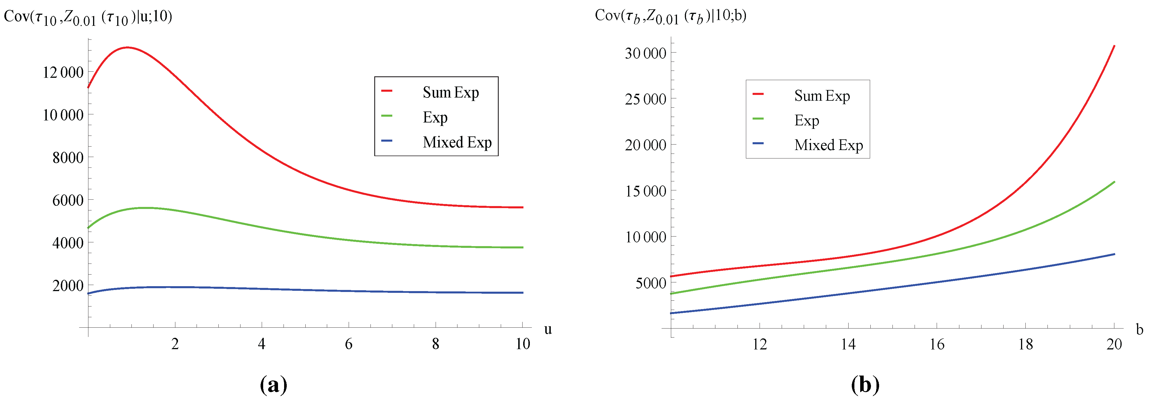 Now, we shall apply the results in the previous sections to study some new ruin-related quantities with numerical examples. Throughout this section, we assume the cost function , so that is the aggregate discounted claim amounts until ruin. The quantities of interest include the expectation and the variance of , as well as the covariances between any two of , the total discounted dividends until ruin and the time of ruin . For our purposes, it will be sufficient to use the penalty function . For simplicity, we shall use to denote the expectation of the random variable X given an initial surplus and dividend barrier b. Then, the variance and the coefficient of variation of X are and , respectively. Similarly, and , respectively, represent the covariance and correlation of and given and barrier b. All of the components required for our analysis are obtainable from the Gerber–Shiu function in Equation (3). While the k-th moments of and are simply and , respectively, the k-th moment of is given by (and we only need ). Moreover, one has , and the first order joint moments involving are and .