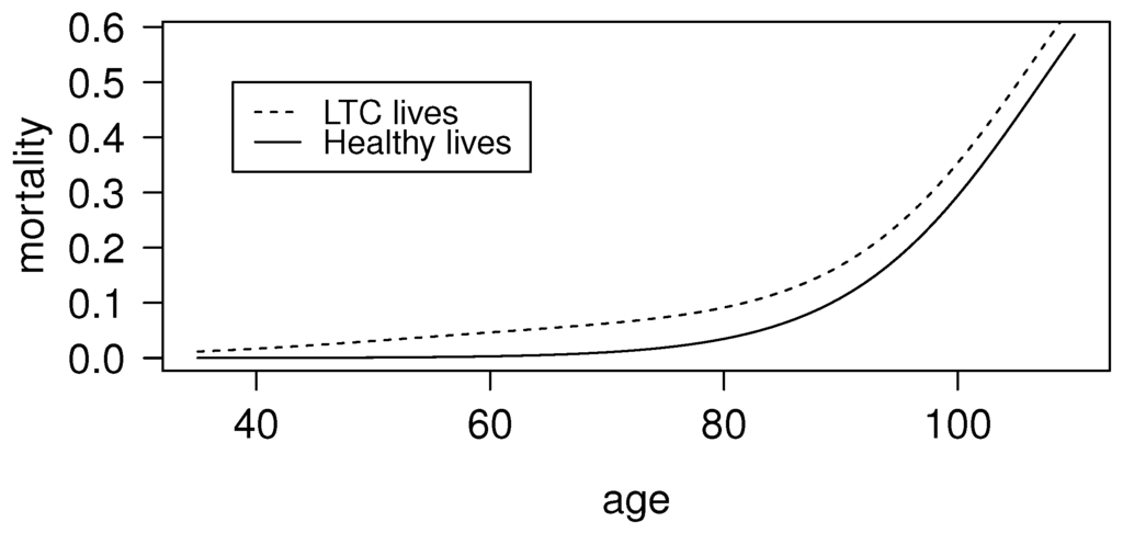 As regards the numerical values of the parameter δ, we in particular note that values lower than one (say, ) can express a realistic estimate of the probability of becoming disabled, since only severe LTC states are considered to qualify the insured as eligible for LTCI benefits.