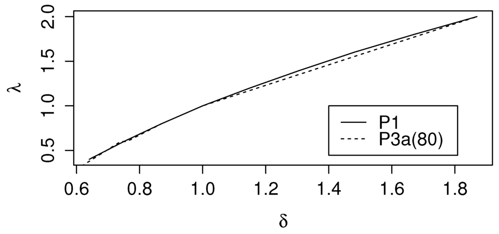 The following comments may be helpful in understanding the choice of the intervals for the parameters λ and δ and the impact of parameter values other than one. First, we note that, intuitively, the actuarial values of payments linked to LTC would increase as the probability of entering into LTC increases and would reduce as the extra-mortality from the LTC state increases. If an LTC benefit is added as a rider to accelerate insurance payments in whole-life assurance, the certainty of the payment implies that the actuarial value would be less sensitive relative to a similar LTC payment that is uncertain.