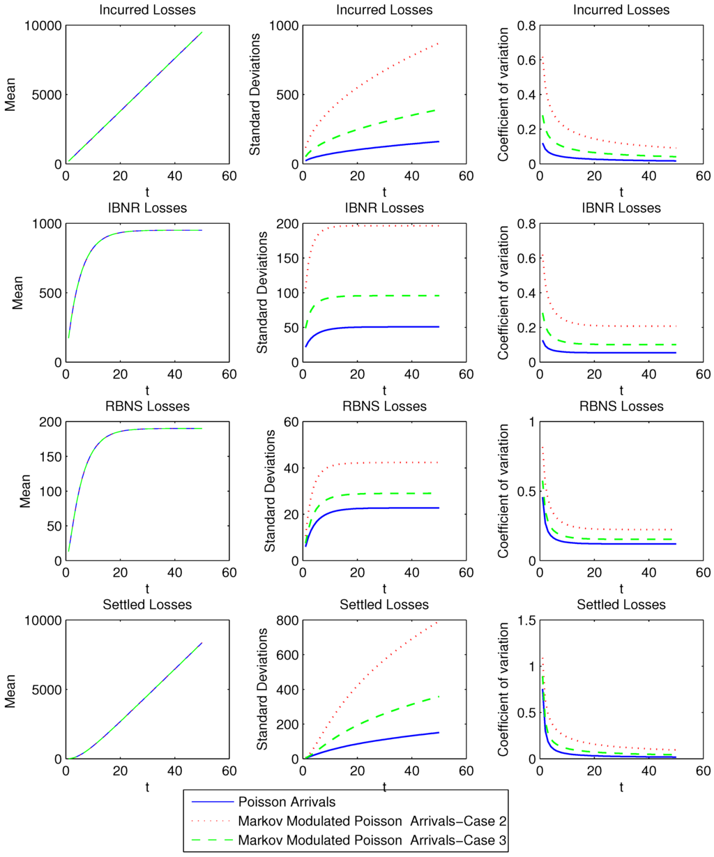 The mean, standard deviation and the coefficient of variation of the amount of the IBNR, RBNS and Settled claims for the three cases are computed using the formulas developed in Section 4. The values are plotted in Figure 1, from which it can be seen that the mean amount of IBNR, RBNS and Settled claims coincide in the three cases, however the standard deviations and the values of the coefficient of variation are very different. For case 1, IBNR and RBNS losses are independent because of the Poisson arrival assumption. However, as shown in Figure 2, the amount of IBNR and RBNS claims in case 2 and 3 are correlated, with the correlation affected by the burstiness of the claim arrival process.