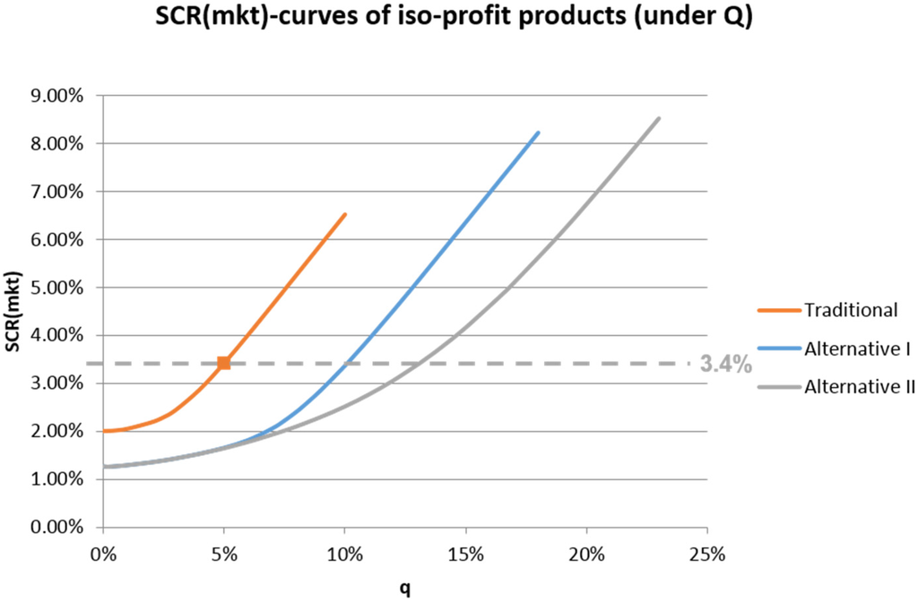 As a reference point, we again use the traditional product with and . From an insurer’s perspective, this product has an expected profit of 3.62% and a Solvency Capital Requirement for market risk of about 3.4%.