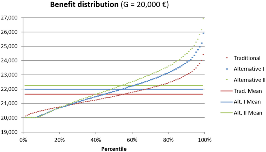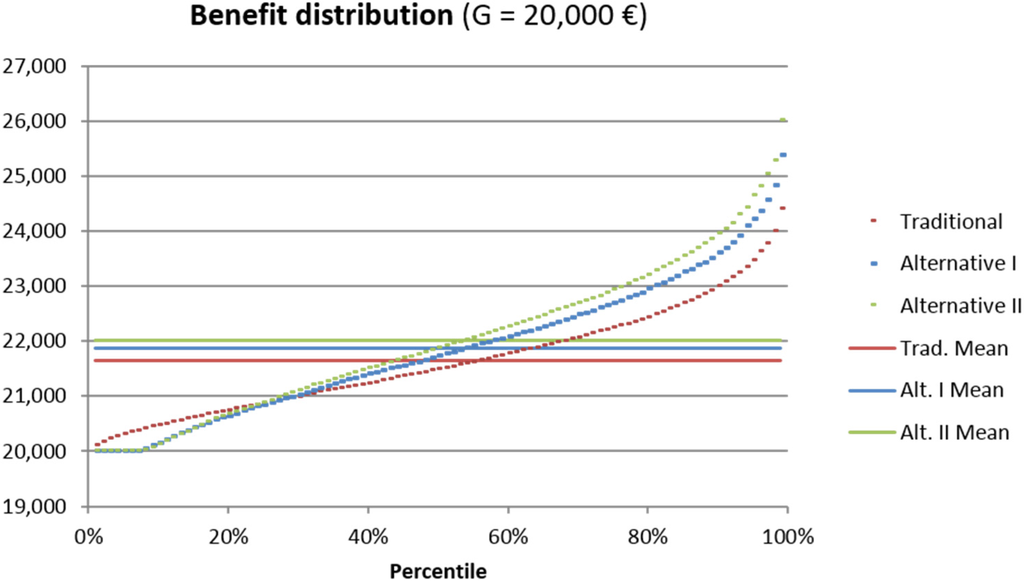 Figure 5 shows the benefit distribution of the resulting products from the policyholder’s perspective. We can see that these products, which leave the insurer’s profitability unchanged and provide a significant reduction of the insurer’s risk, provide higher benefits for the policyholder in most scenarios. Again, the alternative products’ benefits are below the traditional product’s benefit only up to the 25th to 28th percentile. Due to the guaranteed maturity benefit that is the same for all three products, however, the difference is limited.