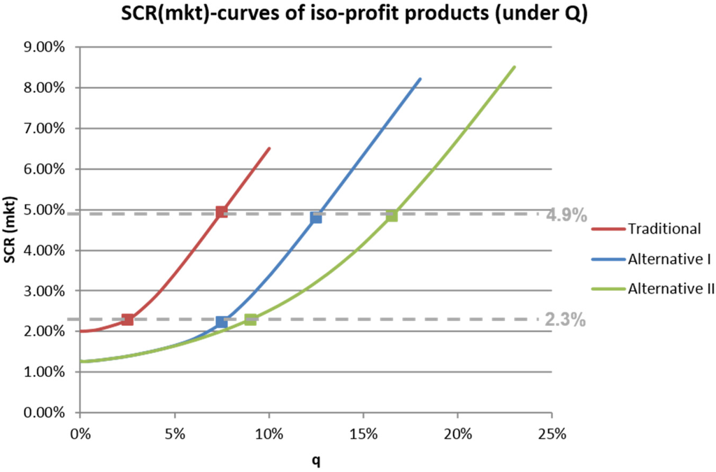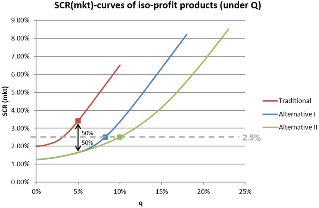 We can also see from Figure 2 that the alternative products allow for a significantly higher equity ratio if we consider products with identical profitability and identical risk.