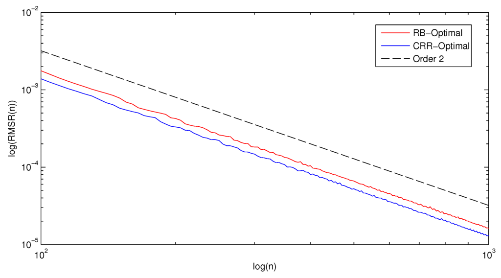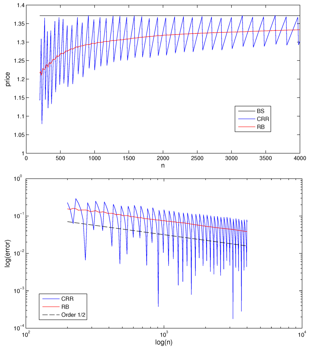 Consider the following log-log plots with the convergence behavior of the 3/2-optimal RB-based and CRR-based trees. By Proposition 1, we should see the slope of in the graph. The convergence is not smooth, and the graph is not a straight line; however, the general trend is present.
