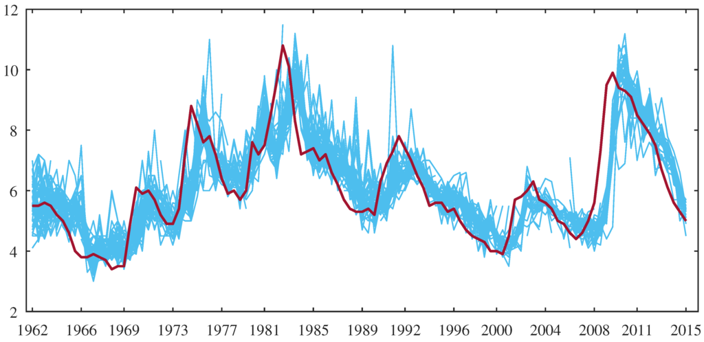 An illustrative visual example that highlights this issue is seen from Figure 1 below, which shows forecasts of the US unemployment rate 12 months into the future from the Survey of Professional Forecasters (thin light blue lines), together with the actual realized unemployment rate (thick dark red line). There are a number of features that are intriguing from this plot, but let me discuss just a few. First, note that the overall predictions from the professional forecasters have the same trajectory, that is, turning points in the series, despite showing some variation in them. The predictions are dispersed, so there is variability in the forecasts of the individuals, but the turning points no one seems to be able to predict. This is particularly evident around 2001 and 2008. Second, the forecasts lag by about 1 year (4 quarters) behind. This suggests that all professional forecasters seem to utilize, to some extent at least, the same type of dynamic econometric model to generate the forecasts. Third, all prediction models that are used by professional forecasters seem to be based on the idea of mean reversion, where the series today is constructed as a weighted average of the (unconditional) mean of the series and the deviation of the series from its mean. If the mean of the series was higher in the recent past, the prediction from the model will tend to revert back to this higher mean. This property of the model based forecasts is clearly and systematically visible from Figure 1. For instance, at the beginning of the sample, the mean was between 6 and 7. Over the period from 1995 to 2001, nearly all forecasts made are systematically above the realized value. Similarly, between 1999 to 2001, the mean had dropped, resulting in systematic under-predictions of the unemployment rate from 2001 to 2004. This pattern continues. Combining forecasts from such similar individual predictions is not going to lead to a great deal of improvement, and can hence be viewed as the econometric or model based analogue to “groupthink”.