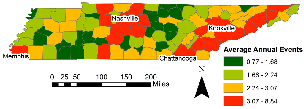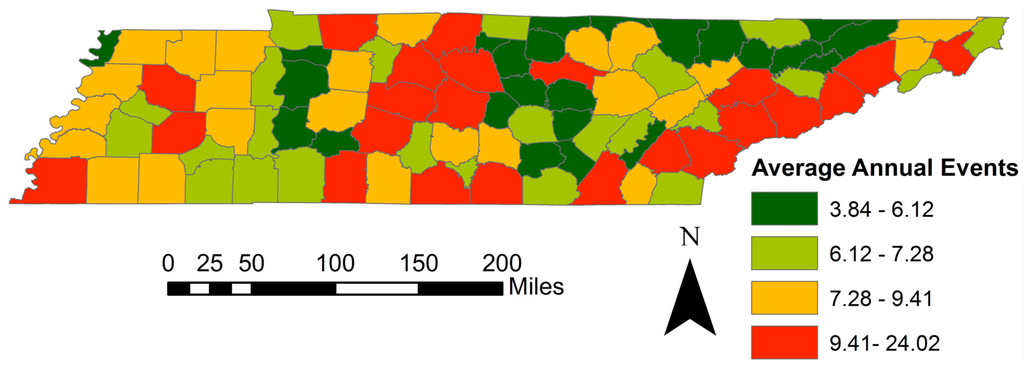 The most frequently occurring extreme weather types in Tennessee have been hydrologic, wind, and winter events, with an example of event frequencies for hydrologic events in Figure 4. Heavy precipitation and various forms of flooding have been experienced more than a dozen times in nearly every Tennessee county. Areas where such events have been most commonly observed (i.e., multiple times annually) are a region comprised of counties located in middle Tennessee and select other counties within the state, particularly Shelby County in the south-western part of the state. Various forms of damaging straight-line winds have posed a significant hazard to all counties within the state. The east and middle Tennessee regions, along with Shelby County, are most heavily represented in this regard. Although all counties in the state experience a winter event on average at least once a year, the dominant area of occurrence, as expected, is in the mountainous topograpy of east Tennessee.