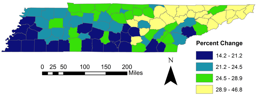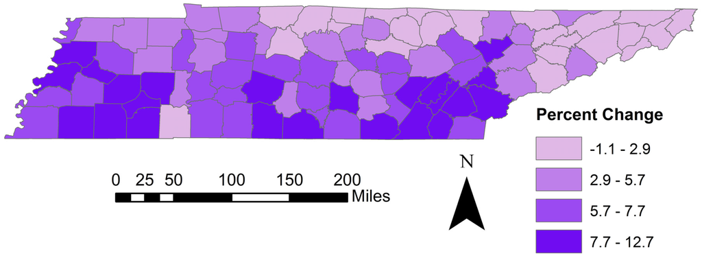 The CMIP3 data utilized in this study was compiled by researchers at the University of Georgia, who generated statistically downscaled monthly averages of both precipitation and temperature for every county in the Southeastern United States for each year through 2060 (Maurer, 2007 []). Given the statewide scope of the Tennessee study, the project focused on the Tennessee data generated by the University of Georgia work, which provided monthly, county-level projected climate data through the year 2060. These county-level data can be particularly useful to planners attempting to project climate variables across areas too large to make the FHWA tool practical. (The State of Tennessee covers 109,247 square kilometers, which would require over 9000 grids to be separately selected and analyzed, and would result in a minimum of approximately 2275 sets of data output to be analyzed, assuming four grid cells are analyzed together.) Accordingly, the CMIP3 data was the primary source of climate projections used in our study, and was incorporated into the spatial analysis of trends and the final vulnerability scores.