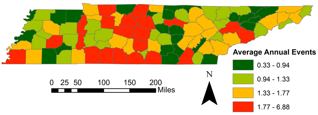 As noted earlier, downscaled climate forecast models have been developed for projecting future temperature and precipitation conditions. However, performing a similar exercise involving other forms of extreme weather that may be particularly disastrous to certain infrastructure or assets, such as high speed winds, is more challenging. More recently, available climate data does contain variables related to surface wind speed, but these data are only beginning to be explored to identify trends in wind speed resulting from climate change (Kulkarni, 2014 []), and have not been downscaled sufficiently to support a project focused on a single state such as Tennessee. Accordingly, the NWS Storm Events Database was an important source of data to increase the utility of the study’s analysis and results.