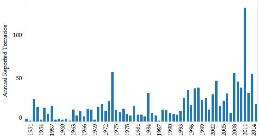 Annual reported tornado events in Tennessee between 1950 and 2014.