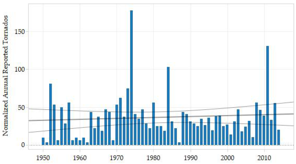 Some of these increases in reported thunderstorm wind and tornado events may be attributed to non-climate and weather related variables, such as more rigorous monitoring/recording practices (e.g., advances in recording technologies) and expansion of populous areas (increasing the number of events that trigger the NWS damage reporting threshold). While the impact of these confounding factors on climate and weather trend analyses cannot be entirely accounted for, the most significant effects attributable to changes in monitoring technologies were taken into consideration in the time series analysis. Due to non-stationarity in the datasets (the mean and the variance of the series is not stable over time), transformation of the data was necessary to reconcile data occurring before and after significant change points. Before conducting a trend analysis, non-stationarity change-points in the data were identified using a beta version of the now available US Army Corps of Engineers Nonstationarity Detection Tool with default sensitivity parameter values (U.S. Army Corps of Engineers, 2016 []). Three change point statistics (Bayesian Change Point (BCP), Change Point Model (CPM), and Energy Based Divisive Method (ECP)) were used to identify points in the time series where a significant shift in the mean, variance, or distribution of the data occurred (U.S. Army Corps of Engineers, 2016 []). One significant change point, which is most likely related to the expansion of Doppler radar-based storm detection, was identified in the data between the years 1993 and 1995 using all three methods (US Department of Commerce, 2016 []). The time series were then separated into two subsets at the change point (1994) and data were transformed by multiplying original values by the ratio of the means of the two subsets. The normalized time series was then checked for significant autocorrelation and partial autocorrelation to ensure that a linear least squares regression model was appropriate. The time series exhibited a weak autocorrelation structure; however, examination of the partial autocorrelation structure indicated that an autoregressive model was not appropriate, as lags greater than zero were non-significant (Natrella, 2010 []). Therefore, a linear regression (normalized annual reported tornados as the dependent variable and year as the independent variable) was conducted to examine the temporal trends in reported wind events, shown in Figure 7. For the purposes of screening assessments, the slope of the trend line calculated using this relatively simple method can then be used as a multiplier in calculating future vulnerability scores (Guan, 2009 []). Where the trend line is statistically insignificant, or the planning horizon is of a significantly long time frame, extrapolation of trends from historical data may not be representative of future trends. In these cases, historical data should be used to arrive at only current, rather than future, vulnerability scores.
