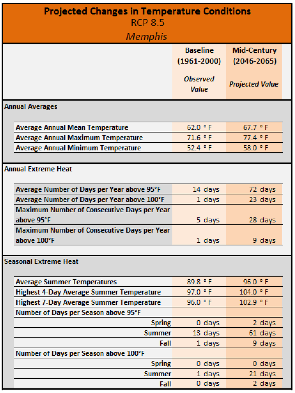 Recognizing that most critical transportation assets are located in or near highly-urbanized areas in Tennessee, the FHWA Climate Data Processing Tool was utilized to provide a more detailed assessment of future precipitation and temperature extremes in the state’s four major cities: Chattanooga (Hamilton County), Knoxville (Knox County), Memphis (Shelby County), and Nashville (Davidson County) (see Figure 1 for locations). CMIP5 data from the FHWA tool was used to run projections for these cities. All 20 available climate models in the FHWA tool were considered in obtaining the most robust current data available, and to reduce biases that may be present in any one model. Consistent with the more general county-level data, downscaled projections for these urban areas showed significant increases in temperature and precipitation. One example of an excerpt from the CMIP5 output data generated from the FHWA tool is shown in Figure 8, which displays temperature projections for the Memphis area through the middle of the century. The tool also displays end of century results, and additional data points not shown in Figure 9 such as extreme cold, including lowest 4-day average winter temperatures and information regarding the freeze-thaw cycle, which can be especially important with respect to pavement conditions.