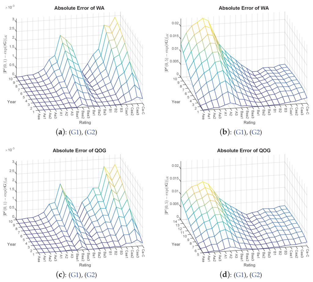 Next, the impact of the additional constraints on the default probabilities is analyzed. Table 4 displays the post optimization default probabilities of the top four investment grade Classes Aaa, Aa, A and Baa of the transition matrix . Evidently, (D1) corrects and to 3 bp, and is affected by (D2), where the hierarchical order of ratings is restored. Subsequently, combining (D1) and (D2) will yield probabilities equal or larger to 3 bp. (M1) and (M2) do not show a major impact on the default probabilities, at least not on the higher ratings. However, a slight change can be registered compared to the (G1) and (G2) case. This may be attributed to the minor correction of being smaller than its right neighbor and, thus, also affecting the default probabilities to some extent. This will become more obvious when analyzing below. (R1), in turn, has a similar effect as (D2) with and . No major changes could be detected for Baa, all within a deviance of bp to the original probabilities at . Overall, the probabilities of BAM compared to QOG do resemble the original values of more accurately.
