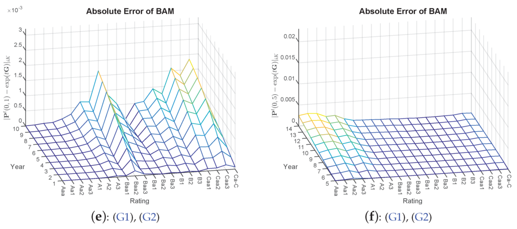 For the following computations, we pretend that is a potential generator of the original given transition matrix for the sake of comparability of the pre- and post-optimization values. Indeed, , whereas , almost doubling the amount of its left neighbor, so that a larger correction is required for . This can be seen in Table 5, where for both optimizations QOG and BAM, the values are adjusted, so that is enforced. However, one can see that QOG already fails to maintain the original default probability of . In the long run, it is obvious that manipulated pre-default stages (here, Caa2 and Caa3) will then have an impact on the future default probabilities, which explains the offset in (g) and (h). Between Rows 17 and 18, several violations of (R1) can be detected. Exemplary for all, the largest discrepancy is picked with and . Table 6 shows that the original < (again, simply is computed of the original transition matrix), but is adjusted by QOG and BAM as required. Simultaneously, BAM can maintain the cumulative sum more closely to the original. The rectification of the rating Caa1 comes at a cost of loosing accuracy in the default probability. However, it can be observed (similarly to the (M1) and the (M2) case) that BAM is still closest to the original PDs. A summary of all effects can then be found in (k) and (l). Noteworthy is the positive effect when combining (M1) and (M2) with (R1), resulting in lower absolute errors in Caa1 compared to (R1) by itself.