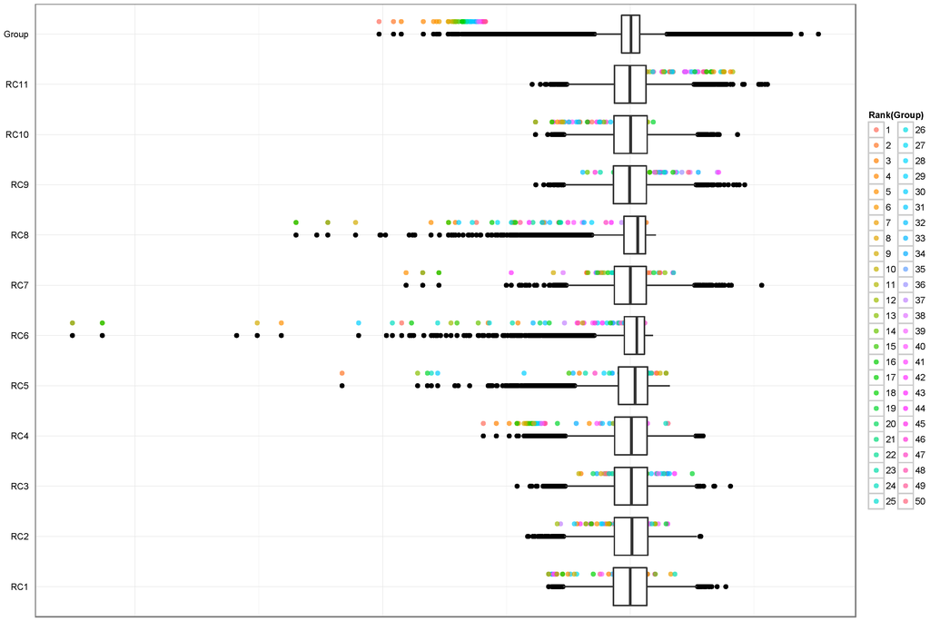 The sequence of box plots and related outliers represent distributions from eleven risk categories that are aggregated and displayed in the first box plot from above. The coloured points above the box plot for the aggregate depict the fifty worst case scenarios. These worst case scenarios are traced back to the risk categories by coloured dots. As the graphs show, these fifty worst cases for the aggregate are not necessarily located in the tail for the contributing risk categories. Hence, the risk management cannot only focus on the tails but on the whole distribution function. The Wasserstein distance fits to this need in a very particular way.