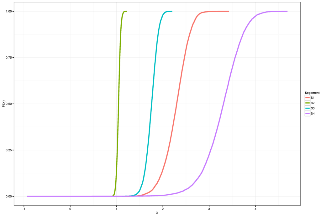 The graph depicts distribution functions that follow a stochastic dominance ordering. The distribution functions may be interpreted as those functions that describe the risk of particular portfolios or segments.