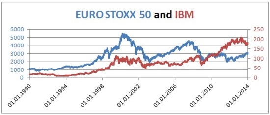 Historical series of EURO STOXX50 (primary axis) and IBM (secondary axis).