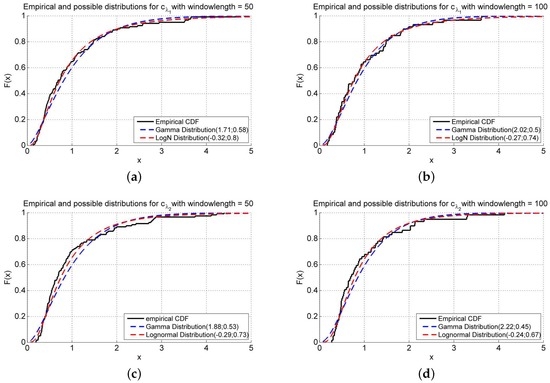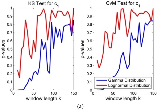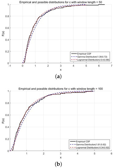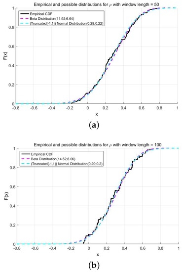where is the empirical and the theoretical cumulative distribution function. While the Kolmogorov–Smirnov test is just based on the biggest distance between the empirical and the theoretical cumulative distribution function, the Cramér–von Mises criterion considers all of the deviations of the empirical distributionfrom the theoretical cumulative distribution function. After introducing two different measures of goodness, we study the different empirical cumulative distribution functions of c, ρ, and . We choose two different moving window sizes: and ; we obtain the resulting distribution, compute the maximum likelihood estimates (MLE) and provide the results from the statistical tests.