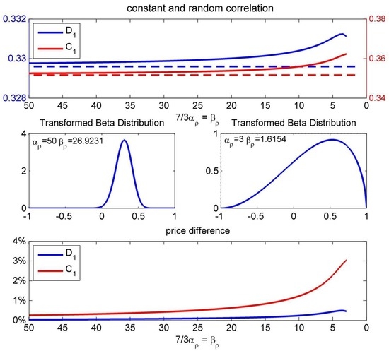 To measure theoretical price impacts resulting from uncertainty about correlation, we assume that follows a transformed beta distribution. We force the transformed beta distribution to vary around the mean of . As one can observe from Figure 8, with decreasing variation of the beta distribution, the prices of , as well as with random correlation converge to the price obtained with constant covariances. The increasing uncertainty about the correlation leads to slightly higher product prices of and .