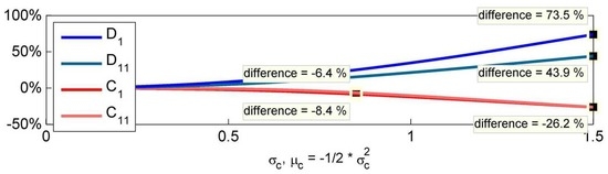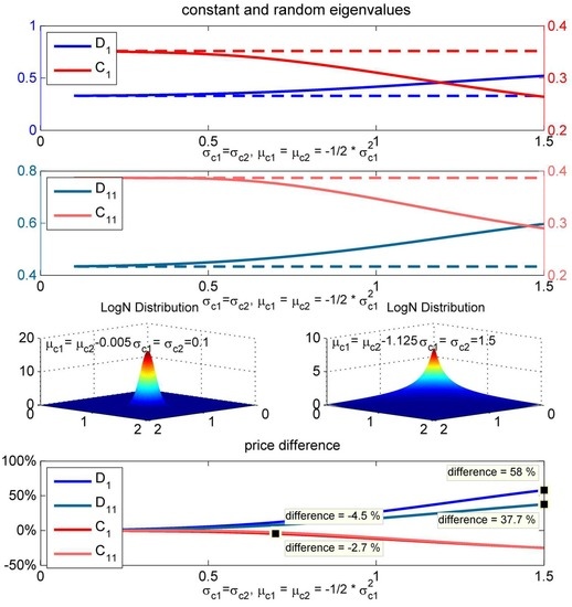 In the case of the double-digital option , lower volatility leads to higher product prices, because the probability of expiring in the money increases, as well as not crossing any barrier. The effect of decreasing volatility for is ambiguous. On the one hand, the probability that one of the barriers will be crossed decreases, and this raises the price. However, on the other hand, the vanilla call options suffer from decreasing volatility (positive vega), because the probability of ending up in the money decreases. Due to the fact that the payoff structure of correlation options includes the product of two vanilla call options, here decreasing volatility leads to decreasing product prices. As one can infer from Figure 9, the considered lognormal distribution with and attaches much weight to prices obtained with low volatility; therefore, the random price of is lower than the constant price.