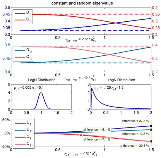 While modelling only the first eigenvalue to add randomness to the covariance, one can observe that is free to assume all possible values. Due to the fact that the lognormal distribution has a positive support, and always stay above their lowest possible value of 0.1716, respectively, 0.0568. Thus, restricting the number of modelled eigenvalues to one implies on the other hand that the practitioner is sure about the fact that and will not be lower than 0.1716 and 0.0568.