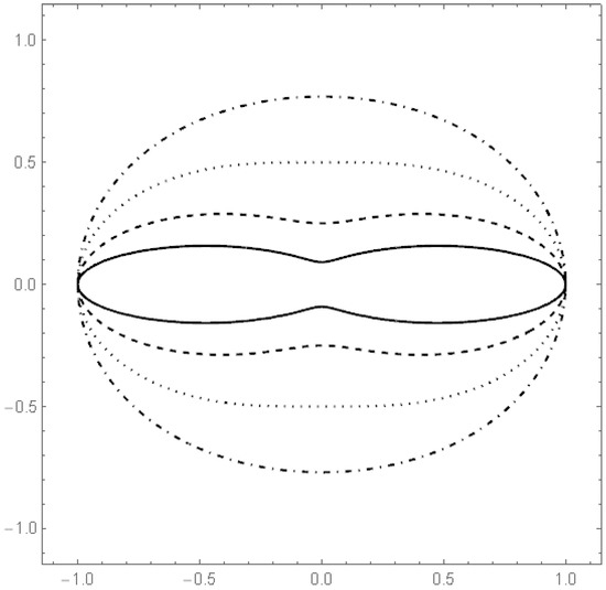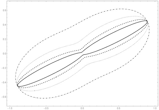 This star body arises from a rotation of K in Example 1 by an angle where . In Figure 5 and Figure 6 the boundaries of (multiples of) K are depicted.