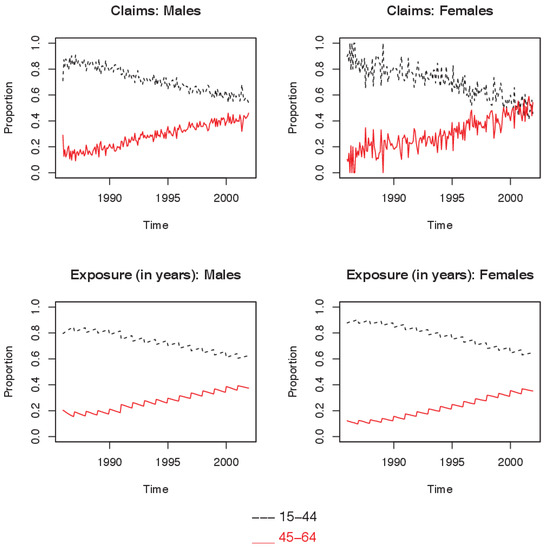 Notably, the proportions reported in Table 2 are based on exposure and claims data over the whole observation period (1986–2001) and do not provide an indication of change over time. Figure 1 shows how the proportion of the data in each of the age groups for both males and females has changed over the observation period. It is clear that the proportion of both claims and exposure for the 15–44 age group has been steadily decreasing while that of the 45–64 age group has been increasing over the period of observation, reflecting a more uniform population distribution exposed to DII. Plots of proportions for occupation class and deferment period are provided in the appendix.