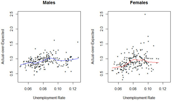 The relationship between the A/E ratio and unemployment rate is captured in Figure 2. The monthly data for A/E and unemployment rate indicate a weak positive relationship for both sexes, with a correlation coefficient of 0.28 and 0.37 for males and females respectively. The blue and red lines are the fitted lowess curves for males and females respectively 10.