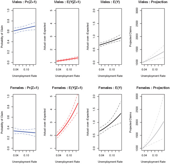 The far left panel in Figure 3 shows the probability that at least one claim occurs, which increases with increasing unemployment for males, and decreases marginally for females. However, the effects are not statistically significant in either of the cases. The next panel illustrates that given at least one claim, A/E rises with increasing unemployment, and substantially more so for females. As the Expected is estimated independently of the unemployment rate, a change in A/E corresponds with a change in the number of actual claims. As shown in Table 4, the effect appears to be statistically significant for both sexes.