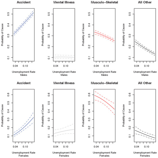 The results of the multinomial logistic model by sex are displayed in Figure 4. The top and bottom panels give the result for males and females respectively. The figures present the probabilities of a claim arising from one of the four causes at a given rate of unemployment, conditional on a claim having occurred. The results indicate that for both sexes, an increase in the unemployment rate leads to: an increase in the relative probability of a claim arising from accidents; a negligible change in the relative proportion of claims from mental disorders; and a relative decrease in the probability of that claims will arise from musculo-skeletal and all other causes 23.