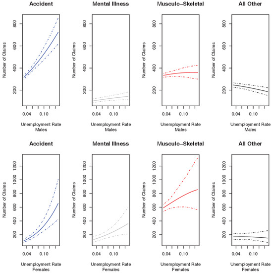 The results presented here are in contrast to prior research which indicates that accident claims tend to be pro-cyclical in nature [4,12]. A plausible argument is that in uncertain or difficult economic times, policyholders may lodge accident claims for minor causes that they would not otherwise report during economic upturns, in accordance with the theory put forward by Schriek and Lewis [3]. Moreover, in accordance with prior research [2], claim numbers from sickness (mental illness and musculo-skeletal taken together) tend to increase with increasing unemployment.